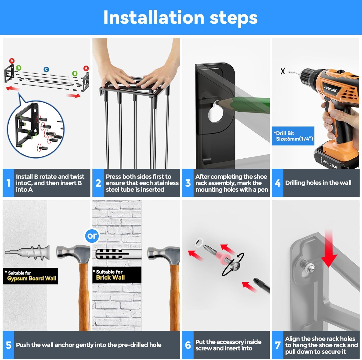 Easy Installation:Installing the DEYILIAN shoe rack is a breeze! It comes with screw for easy mounting.Whether it’s drywall or brick, we’ve got the right anchors to hold it in place. Follow the instructions.Please follow the instruction tutorial to install