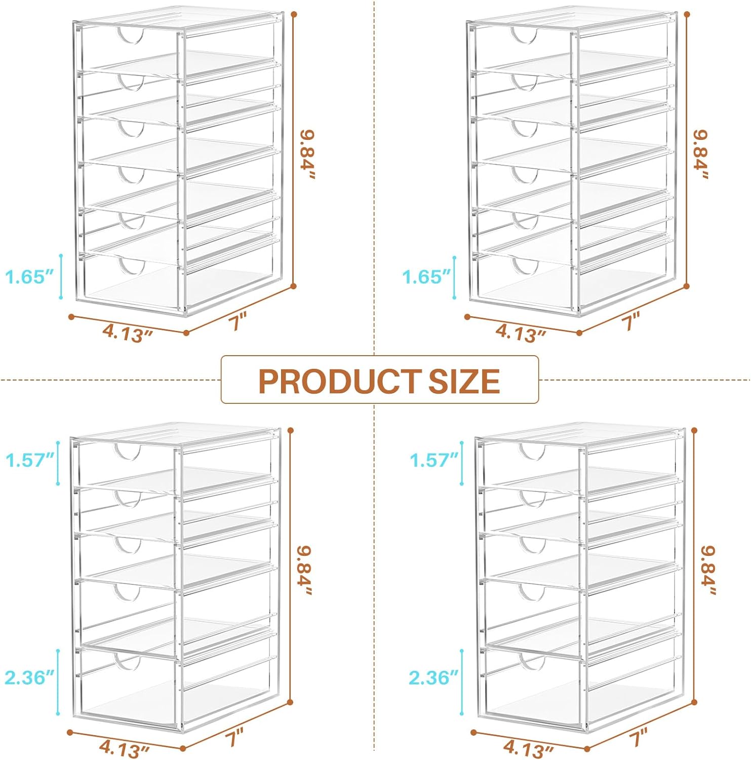 Versatile Organizers: Our acrylic organizers help you to organize everywhere in your home. They can be used as organizers and storage for makeup organizer, desk organizer, office organizer, bathroom countertop organizer, kitchen organizer, or laundry under sink organizer, medicine cabinet, pantry, vanity. Desk organizer with drawers are versatile enough to serve as storage solutions for skincare, perfume, lipstick, blush, foundation, pencil, various beads, Lego,tape, washi tape, glue, sunglasses, hair accessories, jewelry, souvenirs.