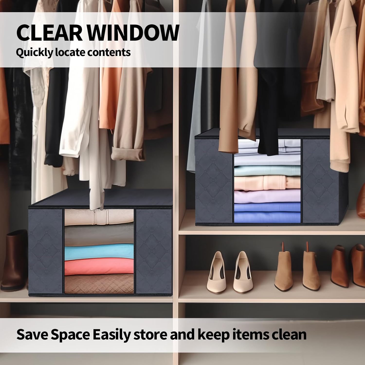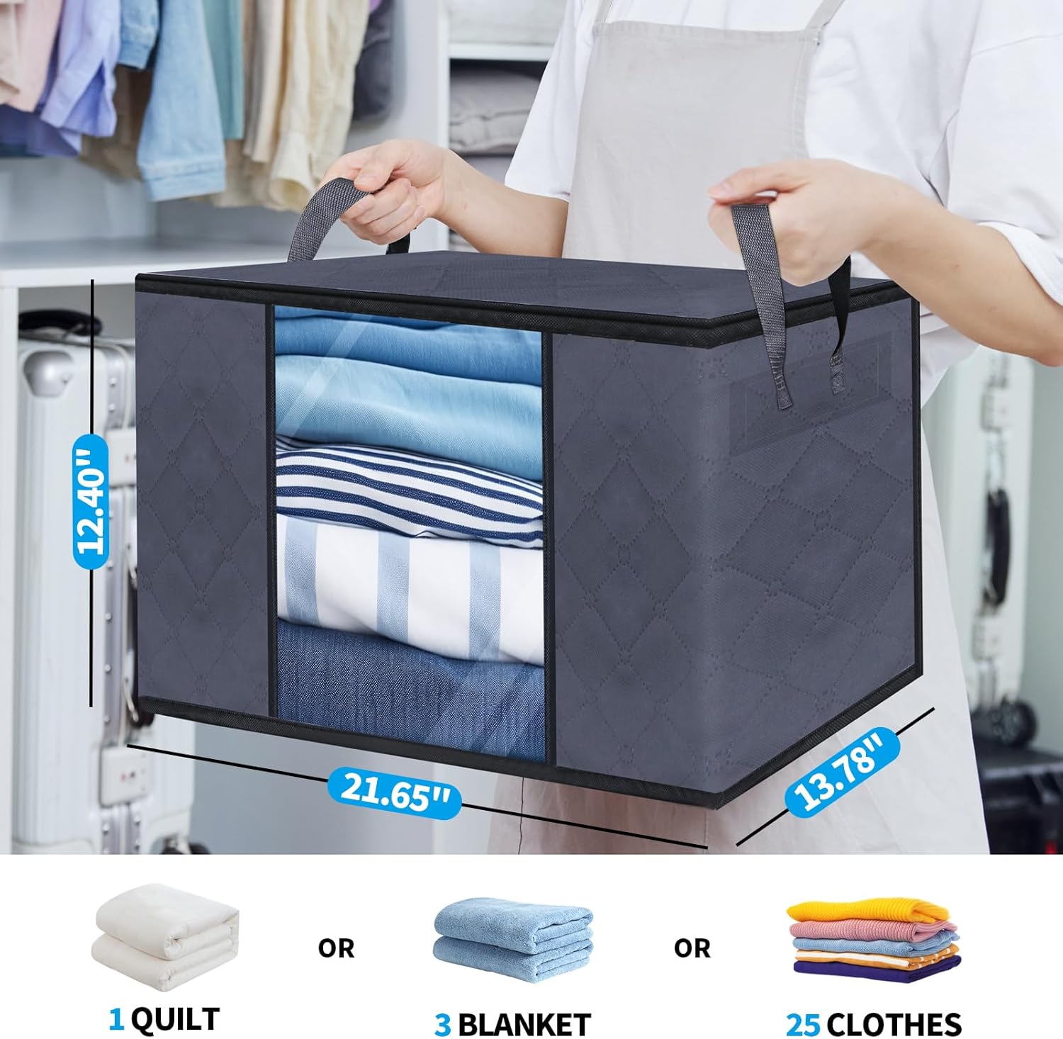 Large Capacity: Measuring 12.40 ” x 21.65 ” x 13.78 “, our storage containers are specifically designed to fit neatly in your closet, maximizing space utilization in your closet. They offer ample space to store seasonal clothes, bedding, sheets, and more