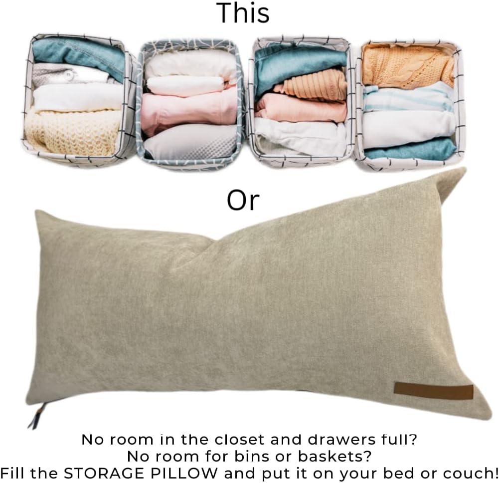 ๐ธThe XL STORAGE PILLOW has over 3.5 cubic feet (~100L) of internal storage volume. Ideal Bedding Storage, Pillow Storage, Comforter Storage, Clothes Storage or Stuffed Animal and Yarn Storage. Use as replacement for full Drawers, Hampers, Storage Bins, Space Saver Bags and Laundry Baskets