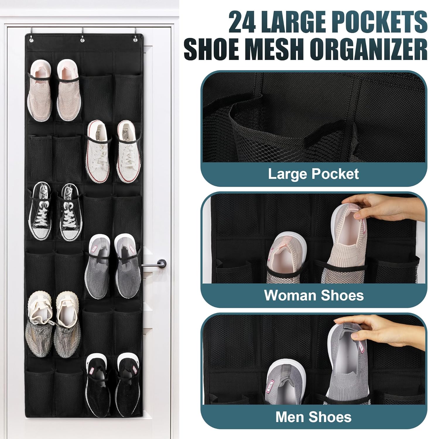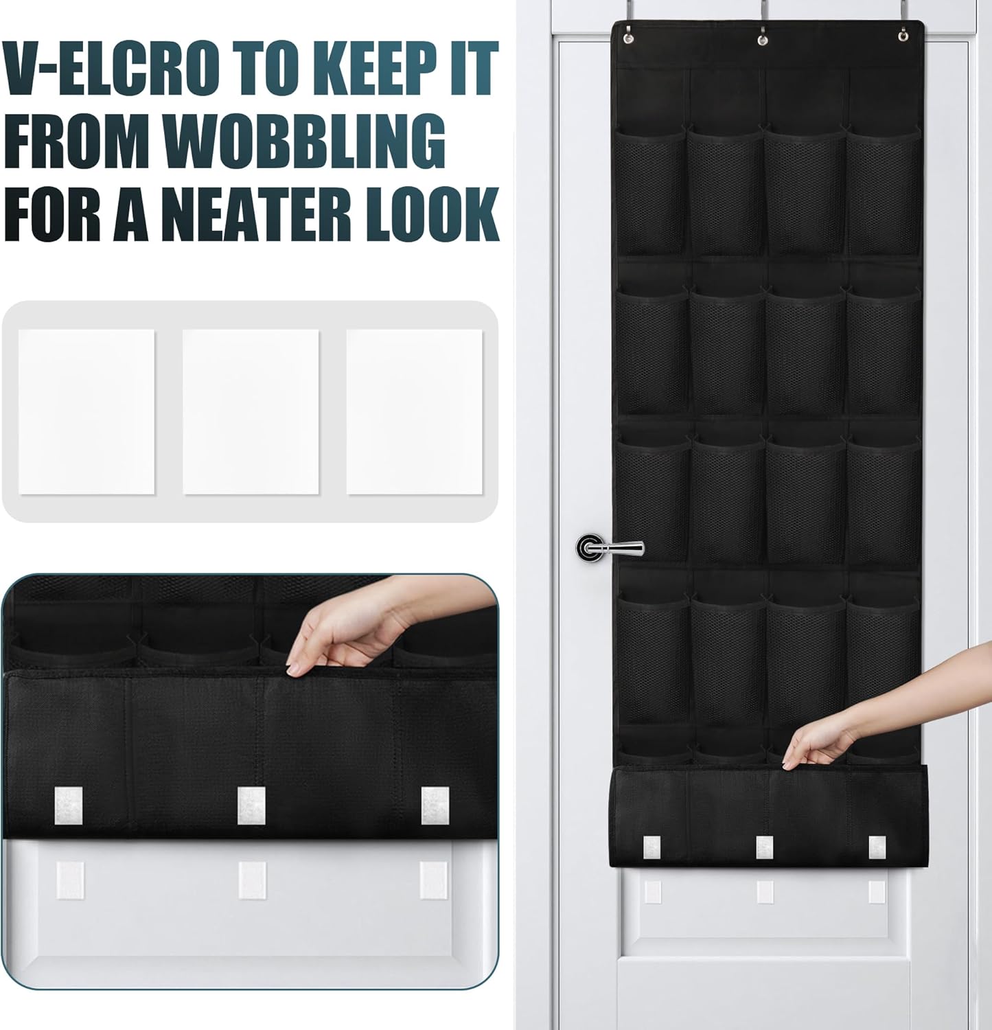 DIFFERENT FROM OTHERS: This door hanging shoe storage box has 24 pockets and can hold up to 40 pounds of items. Contains three V-elcro stickers to prevent shaking, made of durable non-woven fabric with thick stitching and tear resistance. Durable and able to accommodate all your shoes.