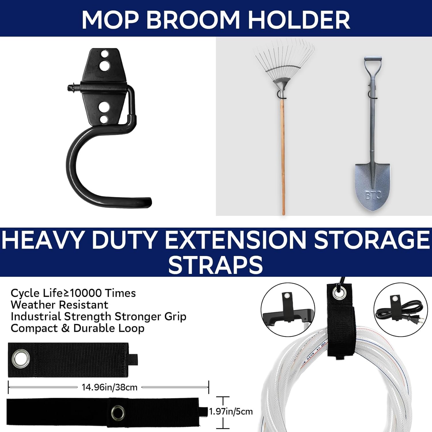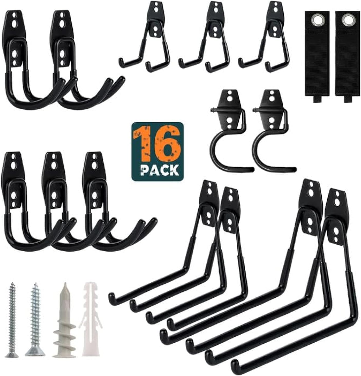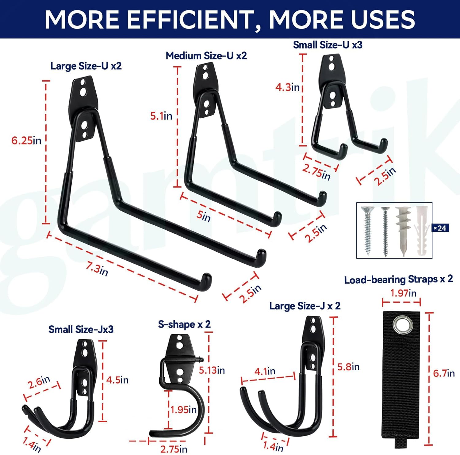 【Extra Mop/Broom Hooks】This Black 16-piece garage hook set comes in 6 sizes: 2 large “U” hooks, 2 medium “U” hooks, 3 small “U” hooks, 2 large “J” hooks, 3 small “J” hooks, 2 “S” hooks, and 2 load-bearing ropes. In addition, the extra “S” hooks are perfect for storing tools like brooms or mops. This versatile garage organization solution allows you to hang various items, from tools to garden equipment, including ladders, bikes, folding chairs, strollers, and even lightweight electric lawnmowers