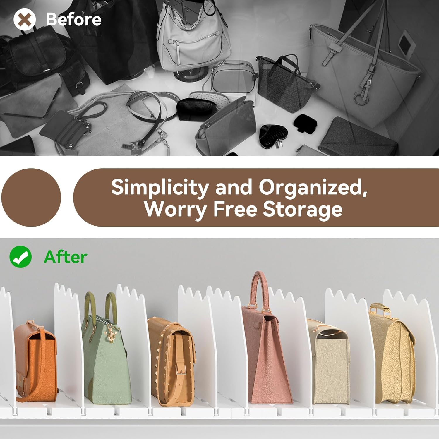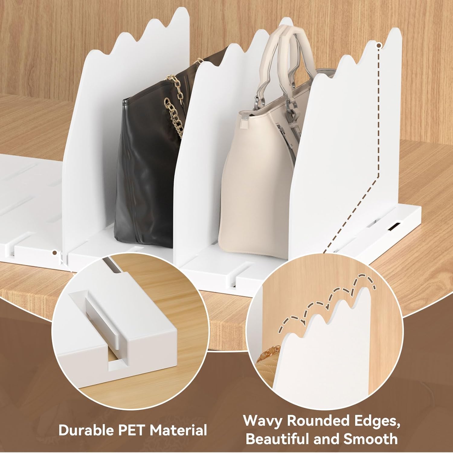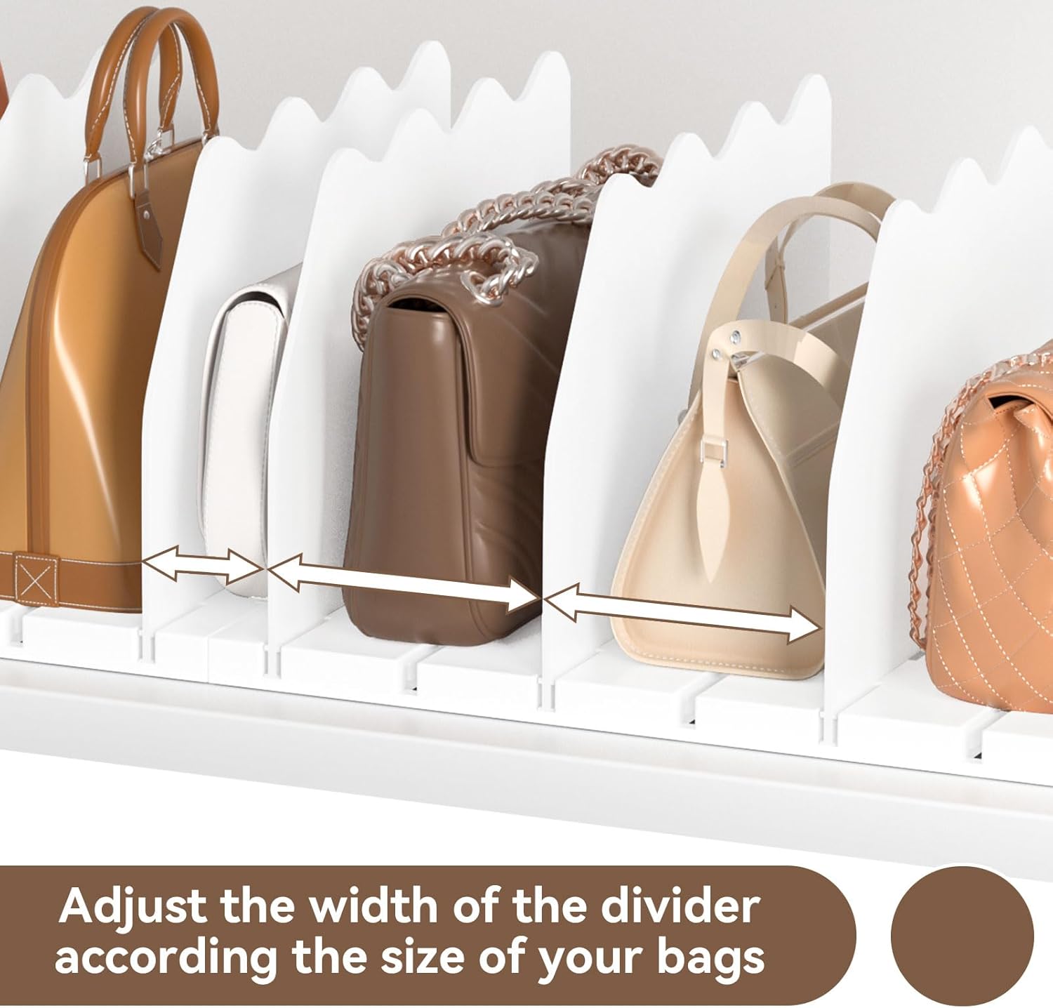 【Adjustable Dividers】Each package includes 2 sets, each set is equipped with 4 dividers. These 2 sets shelf dividers can be connected to accommodate different purse sizes. Perfect for handbags, wallets, shopping bags.
