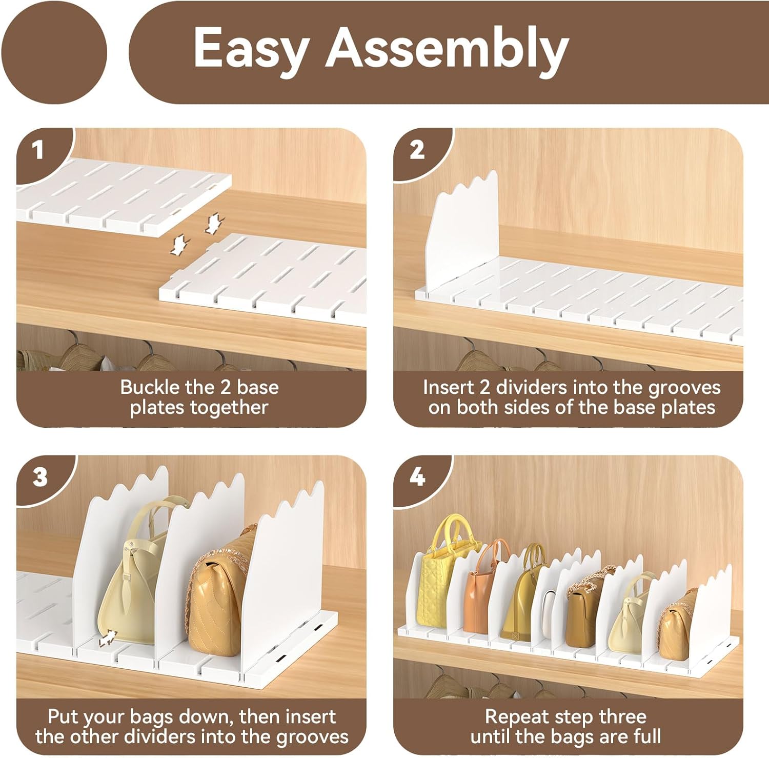 【Easy Installation】 No tools required to install the closet handbag organizers. Simply insert the dividers to the base, adjust the spacing according to the size of your items. The 2 bases can be used individually or connected together to create a customized storage solution for your closet.