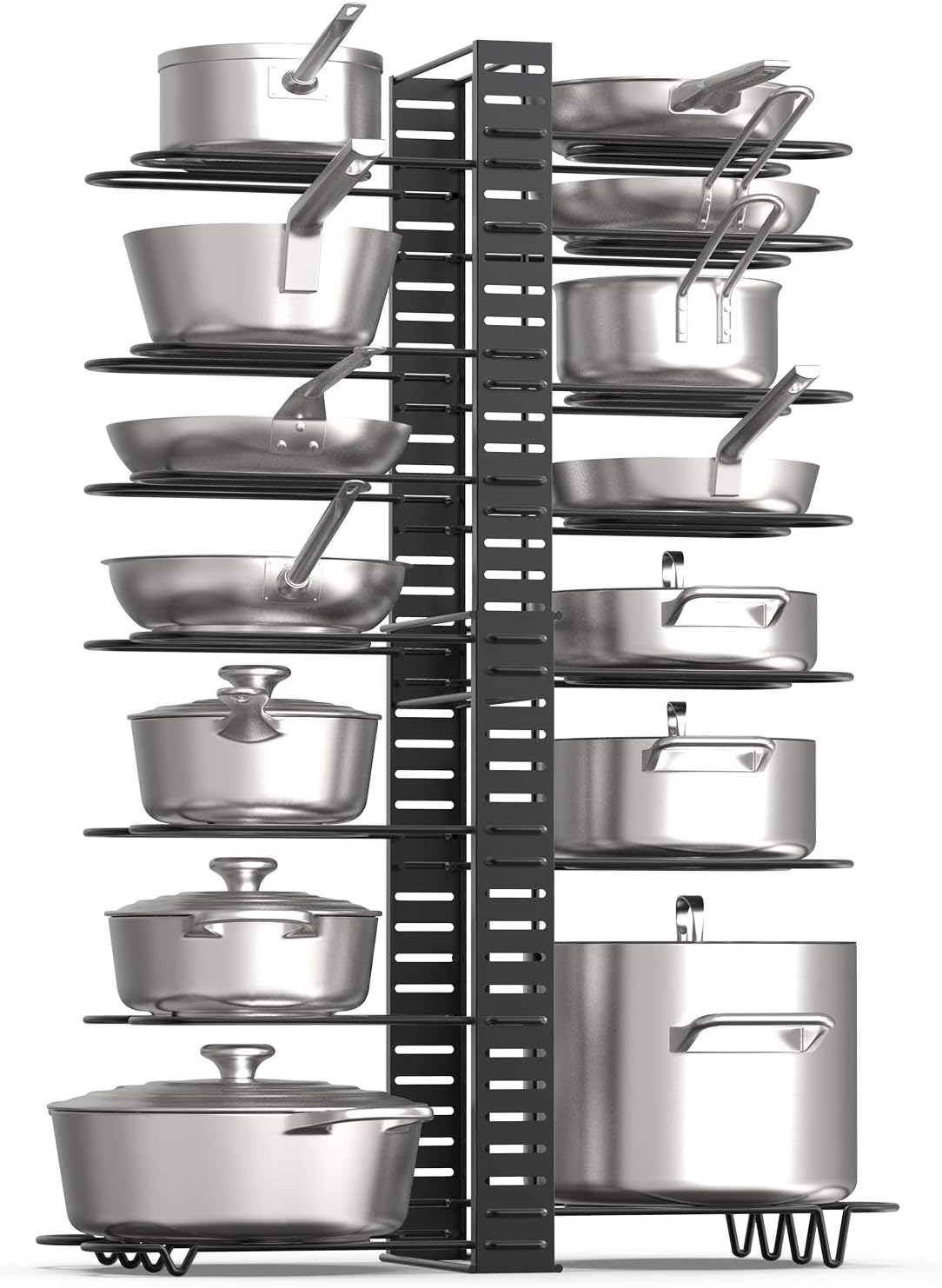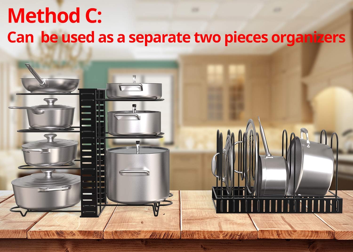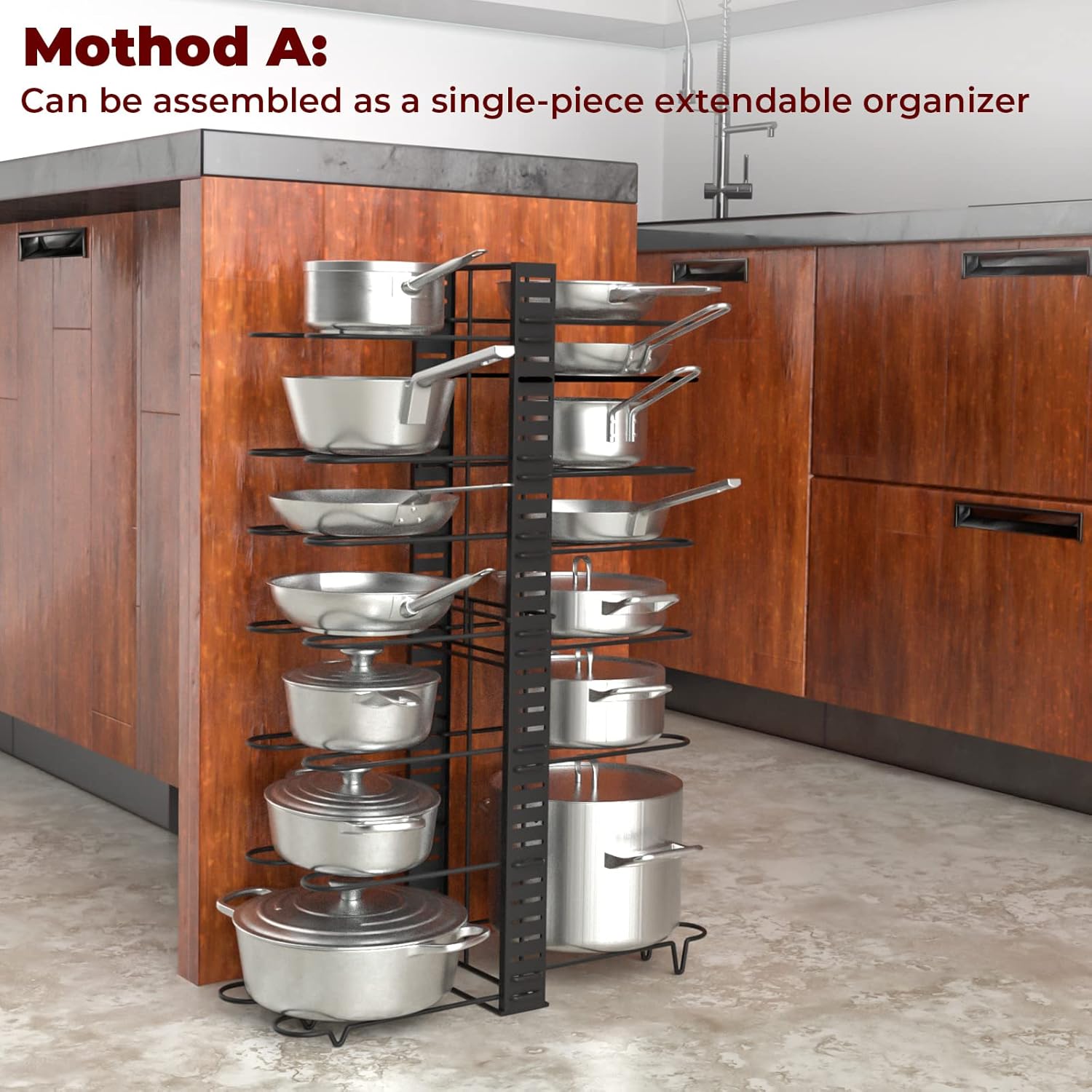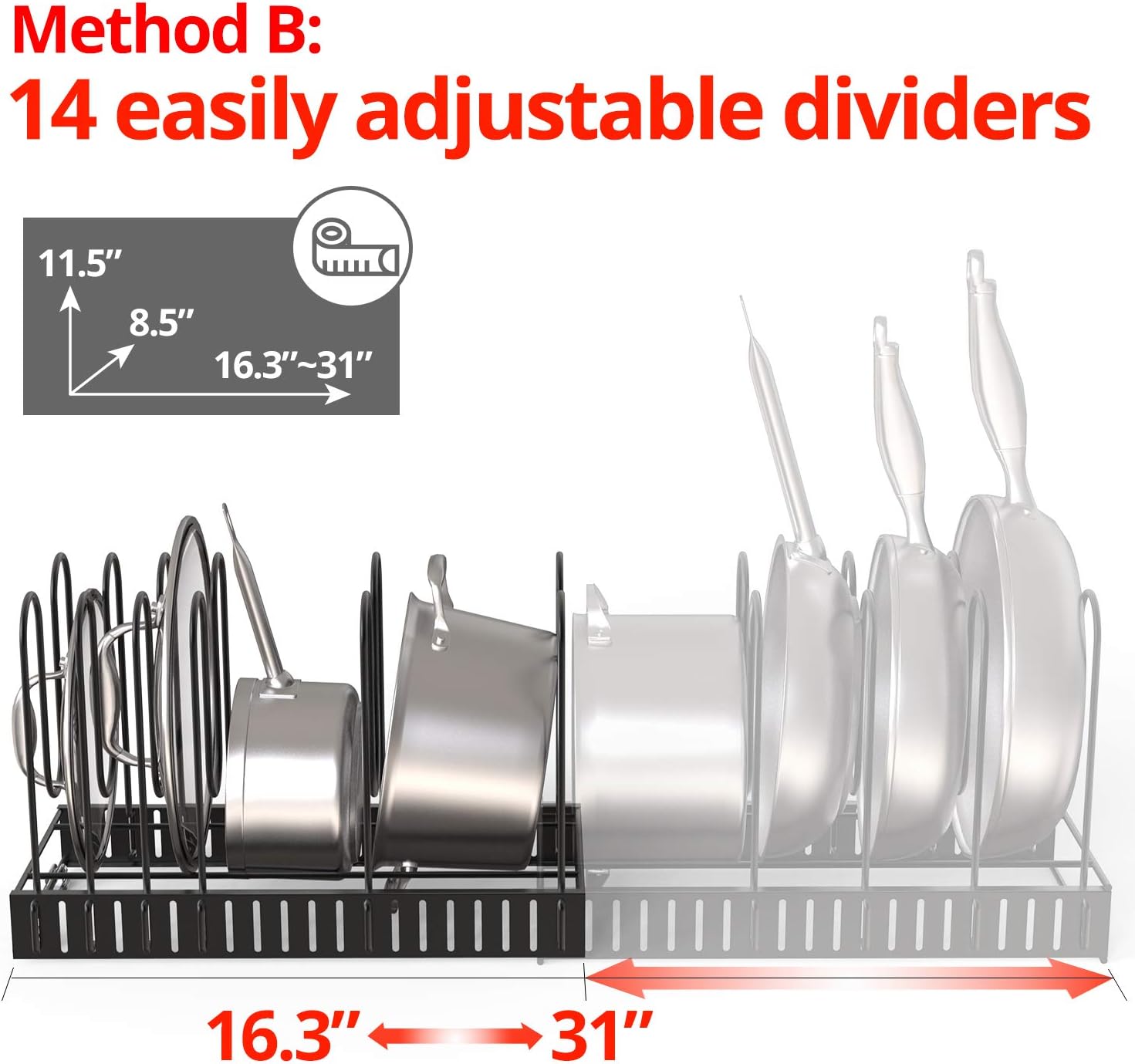 Large Storage Capacity: Adjustable pot holders can store up to 14 frying pans, pots, saucepans, griddles, or lids; designed to maximize kitchen storage and create a clean, organized space