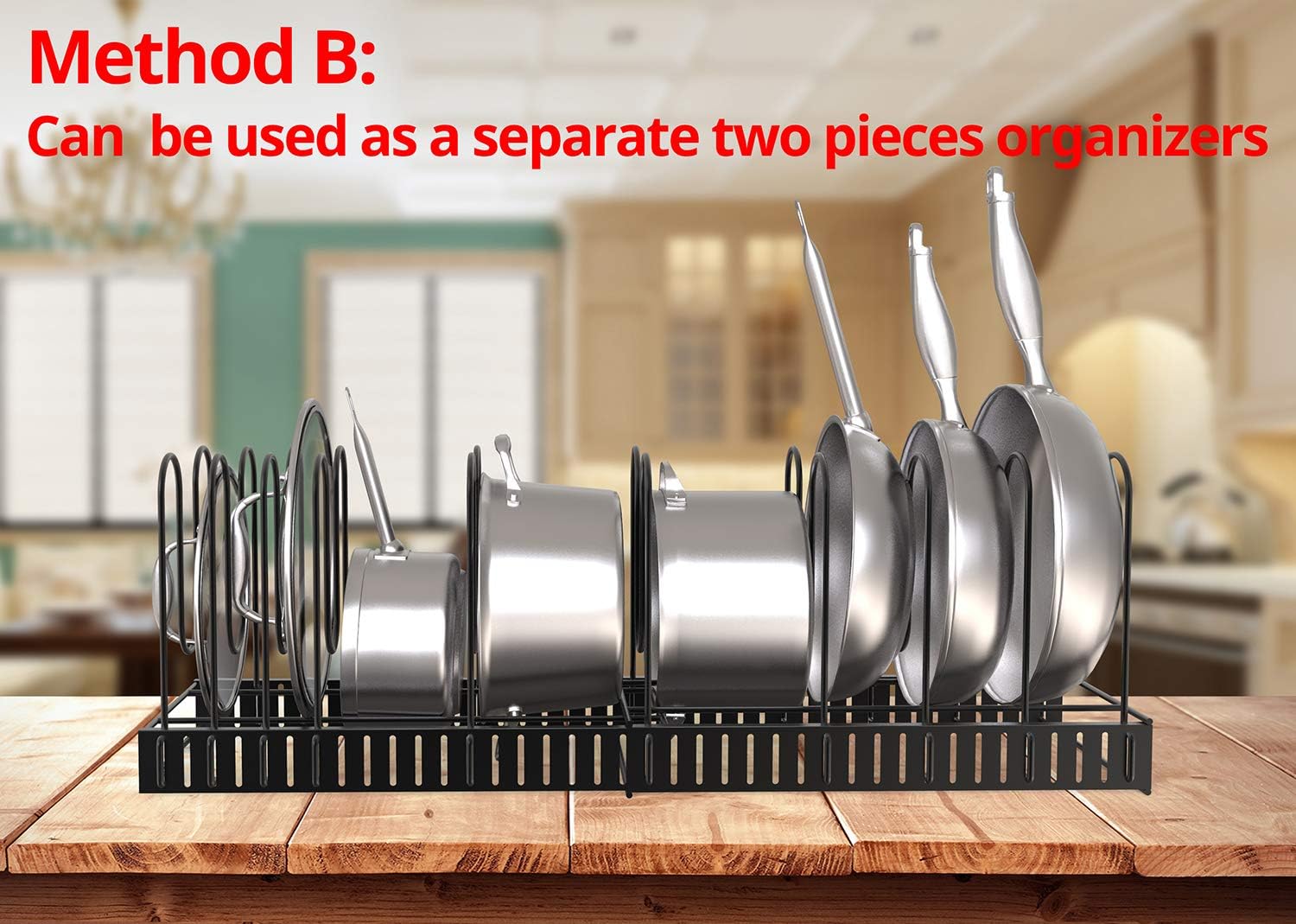 Pot Organizer Rack: Expandable Vdomus pots and pans organizer with adjustable length from 16.3 inches to 31 inches; fits any kitchen space; keeps your cookware neatly stored and easily accessible