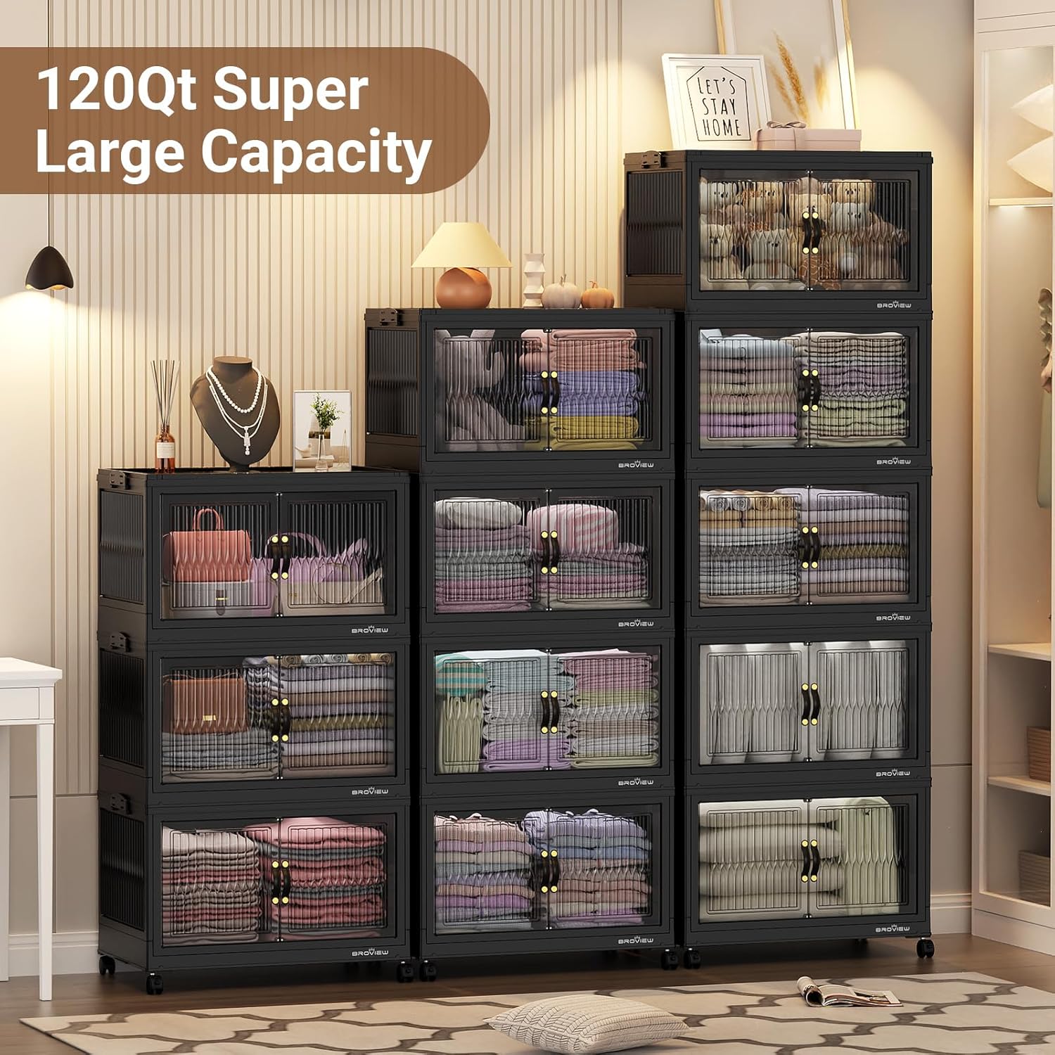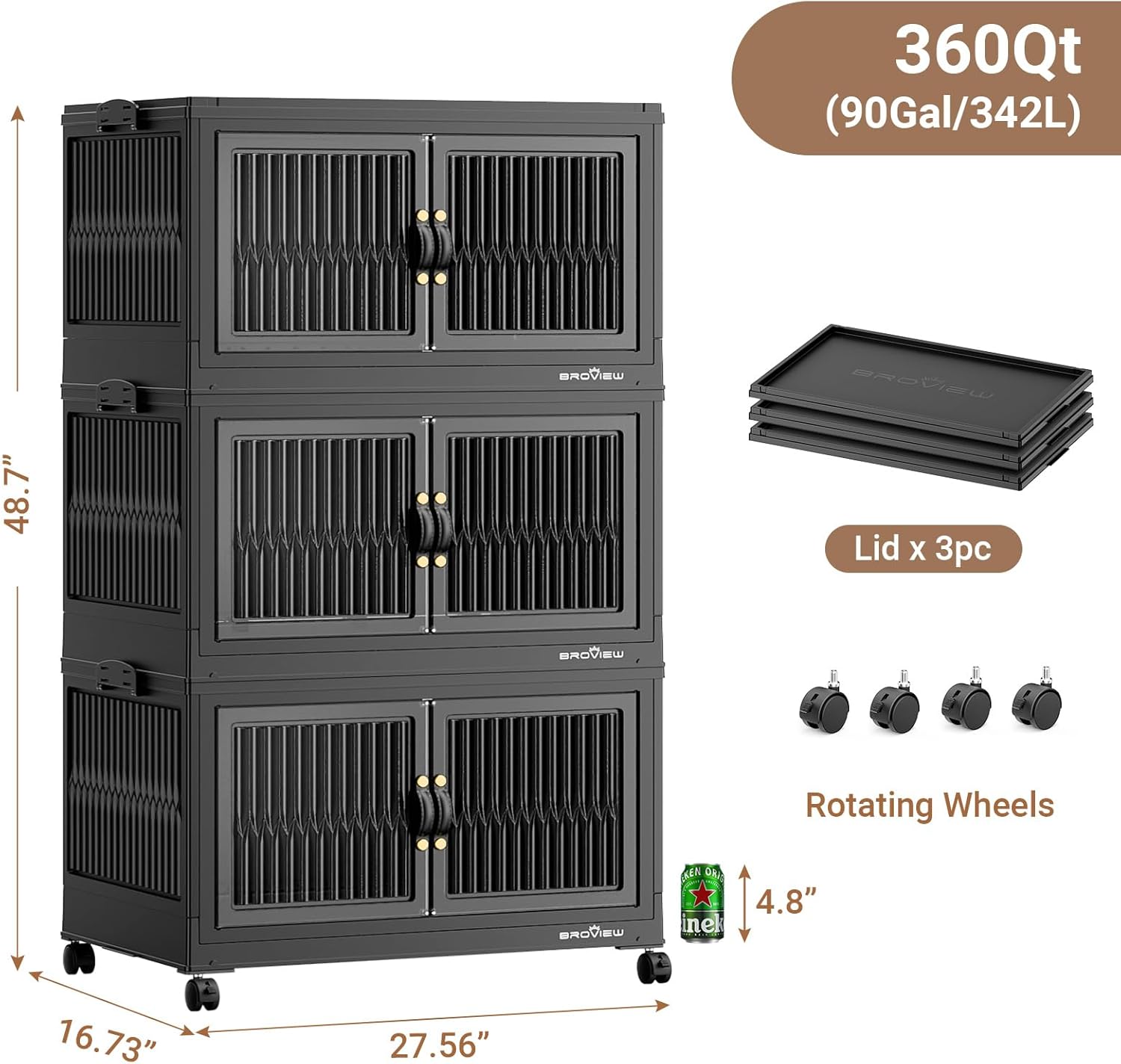 【Large Capacity & High Quality】Each 120qt stackable storage bin with lid measures 27.56 x 16.73 x 15.55 inches (front width x depth x height) and holds up to 120 quarts / 30 gallon. The collapsible storage bin is only 3 inches thick when folded. The plastic storage bins are made of high-impact, shatter-resistant Polypropylene plastic (PP), sturdy, visual, and odorless.
