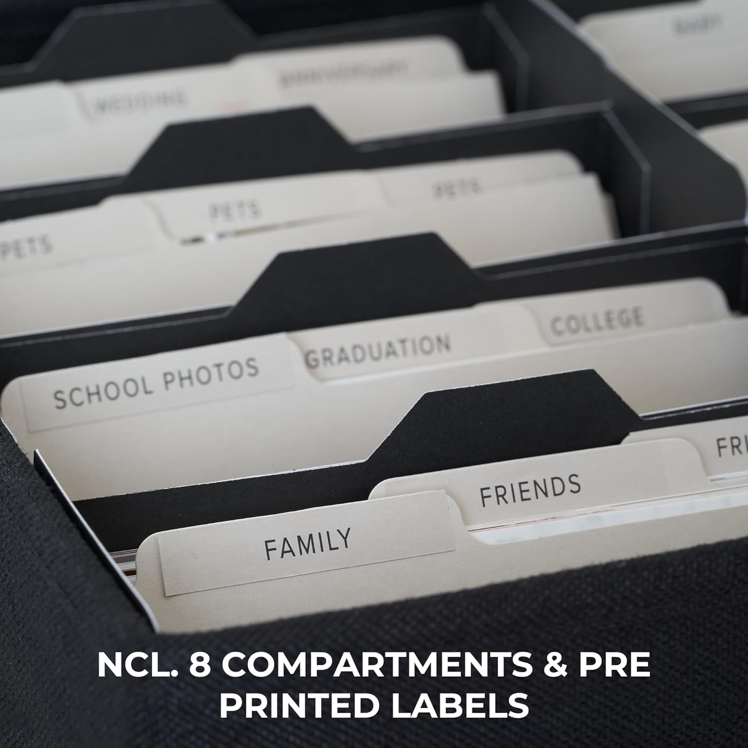 Decorative Photo Box Storage by ZICOTO – The Smart Way to Store Your Best Shots! Your memories deserve more than a shoebox! ZICOTOs’ sleek and stylish photo storage box provides your photos with an exclusive home, keeping them safe and organized while adding a touch of charm to any room. With its refined linen design and modern color, it also doubles as an eye-catching piece of decor. Whether you’re a photo hoarder or just need a better way to store those cherished memories, the beautiful photo boxes storage has you covered. Equipped with eight roomy compartments, it’s perfect for sorting and storing up to 1,700 photos, all sized at 4×6”. From family vacations to special celebrations, there’s plenty of space for all your favorite moments. Thanks to the clever picture box, you’ll never have to dig through a pile of photos again – everything will be neatly organized and easily accessible. Finding that one perfect shot has never been easier. With 30 dividers and smart, easy-to-read labels like “adventure”, “friends” and “childhood”, organizing your photos is a piece of cake. You can quickly sort your collection however works best for you with the photo organizer! The dividers are super simple to use, just slide them into place, and bam – your photos are perfectly categorized and ready to cherish. Measuring 13.3x11x5.2”, the photo storage containers are the perfect size for any shelf, and you can stack several together to save even more space. The built-in label holder ensures you’ll never lose track of your photos, and the included labels make finding what you need quick and effortless. Transform the way you store your photos with the scrapbook storage – super stylish, modern, and designed for ultimate functionality!