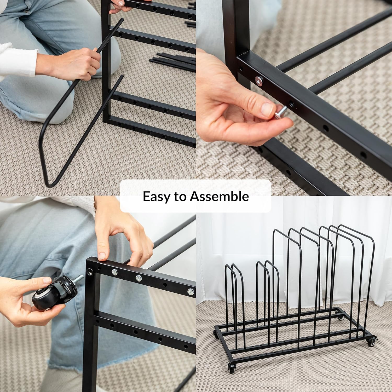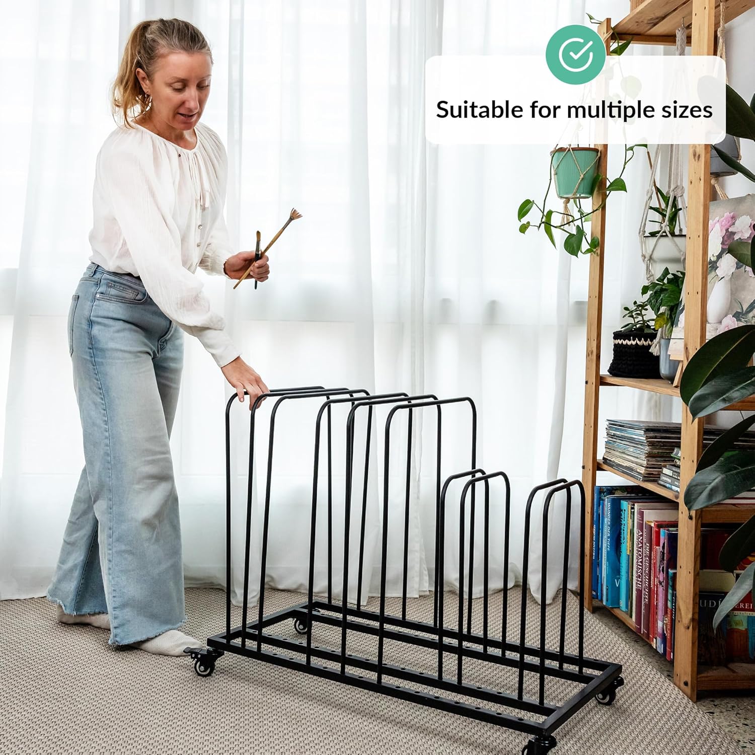 【EASY TO MOVE AND ASSEMBLE】You can assemble the rack in no time! Lock the wheels to securely protect your artwork and improve your art room organization. This Art Rack provides convenient and secure painting storage.