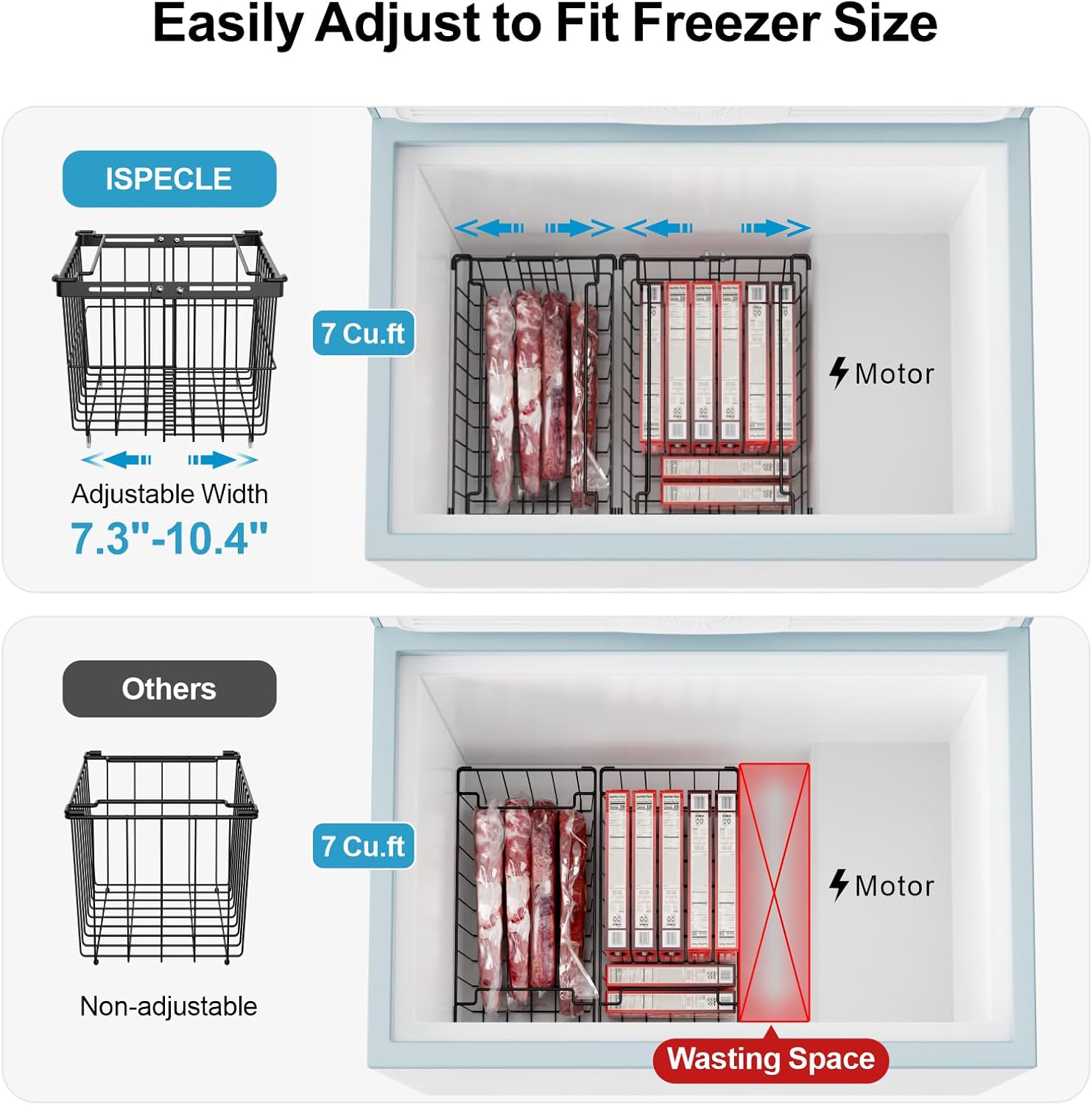 [Customizable Fit for 5/7/9 cu ft Freezer]: iSPECLE freezer organizer bins are made in deeper & wider size 14.8″ L x 7.1″ to 10.63″ W x 8.46″ H; Adjust the width to fill up the available space in chest freezers; Holds 3 bins for 5 cu ft and 6 bins for 7/9 cu ft freezer, no wasted freezer space