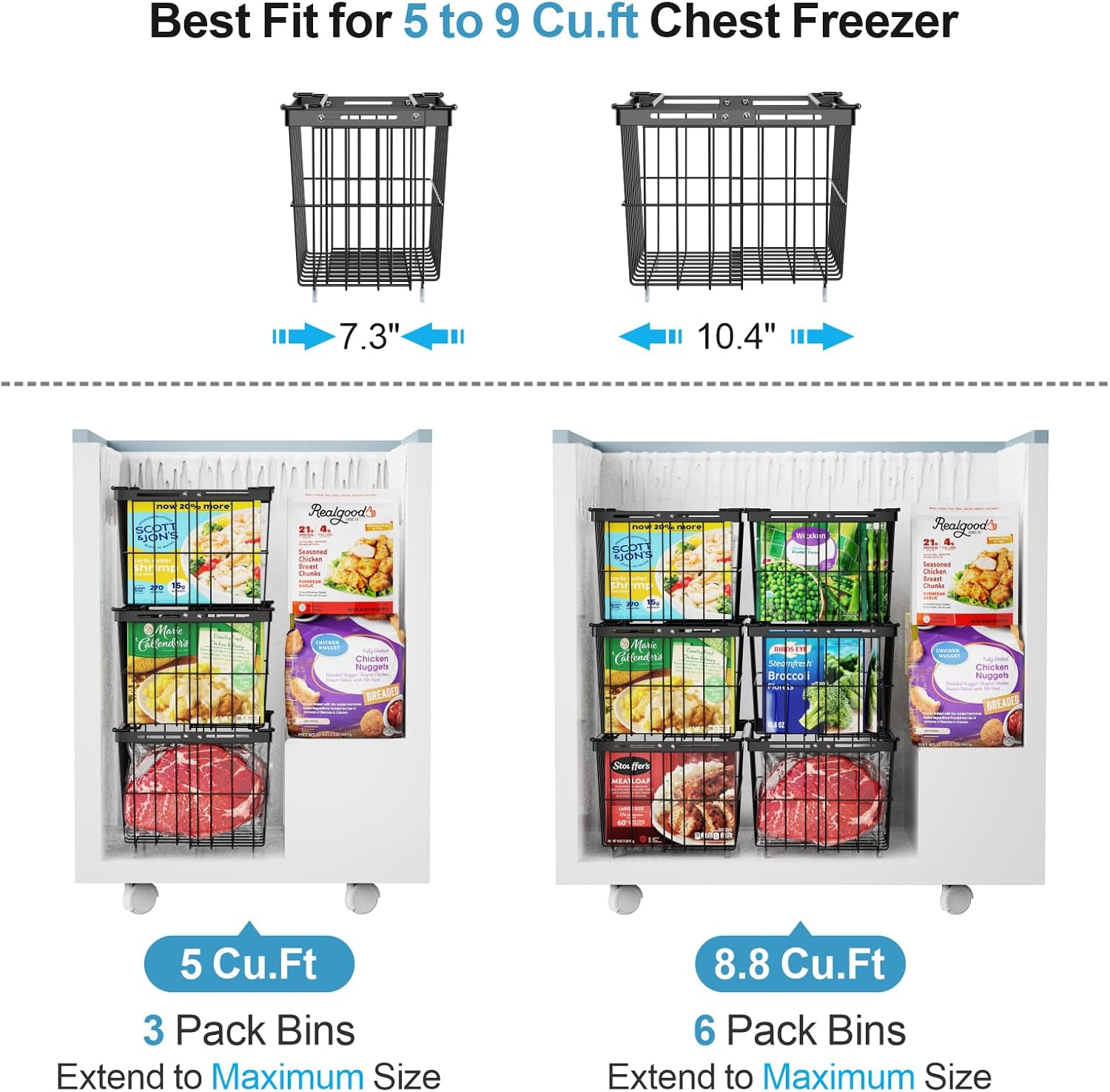 Best fit for 5 to 9 cu.ft congelador freezer space, it uses a combination of 6 stacking baskets to make the best full use of the 7 cu.ft freezer space, and 3 stacking baskets for 5 cu.ft chest freezer. By using baskets for storage, foods can be organized orderly, and quickly find what you want
