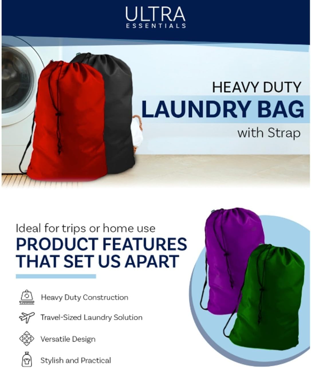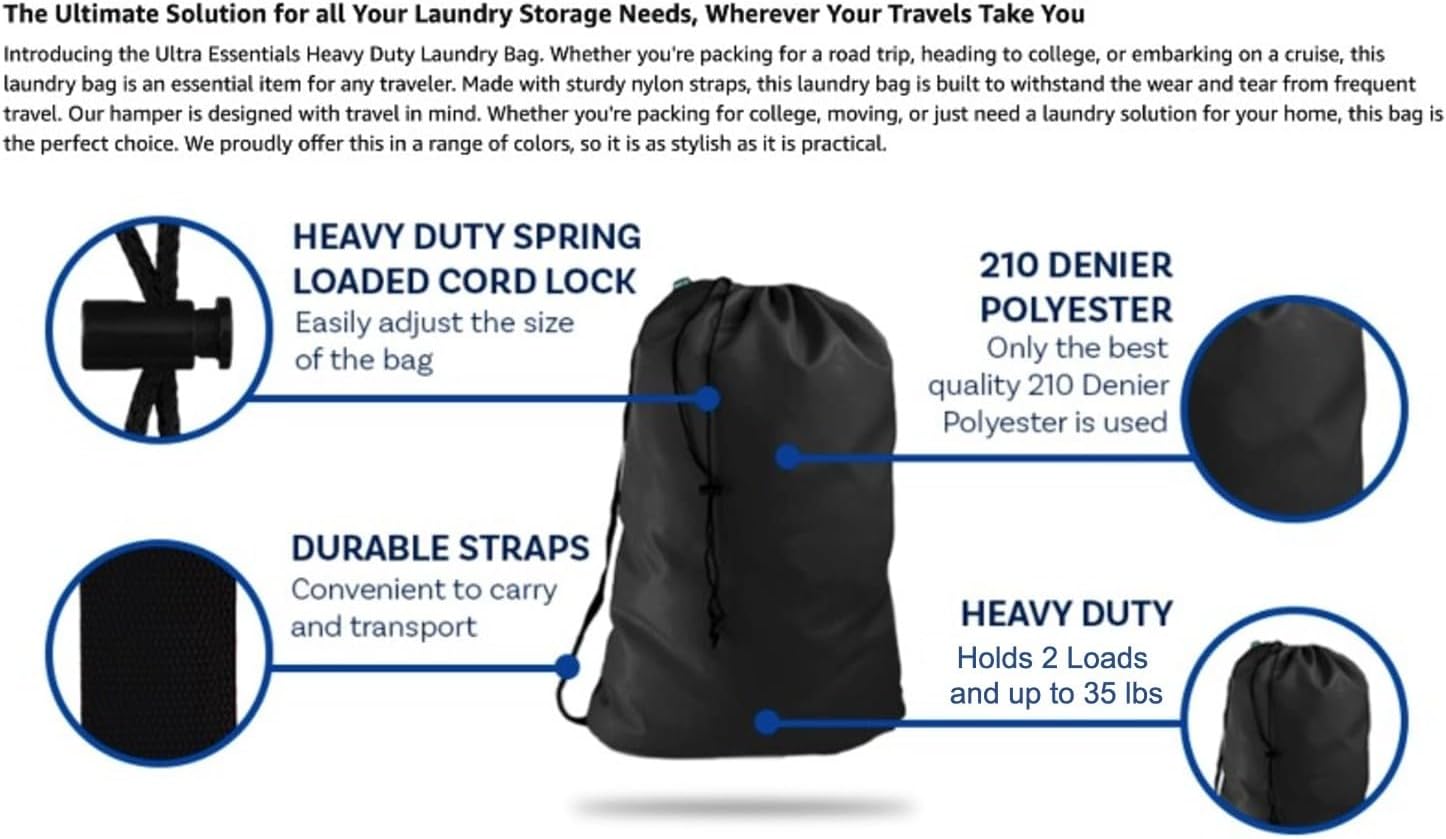 TRAVEL FRIENDLY: Ultra Essentials helps take your laundry on-the-go with the Heavy Duty Laundry Bag. Our tightly woven bag is made of tear-resistant 210D polyester and features a heavy-duty nylon strap. Perfect for road trips, camping, and traveling.