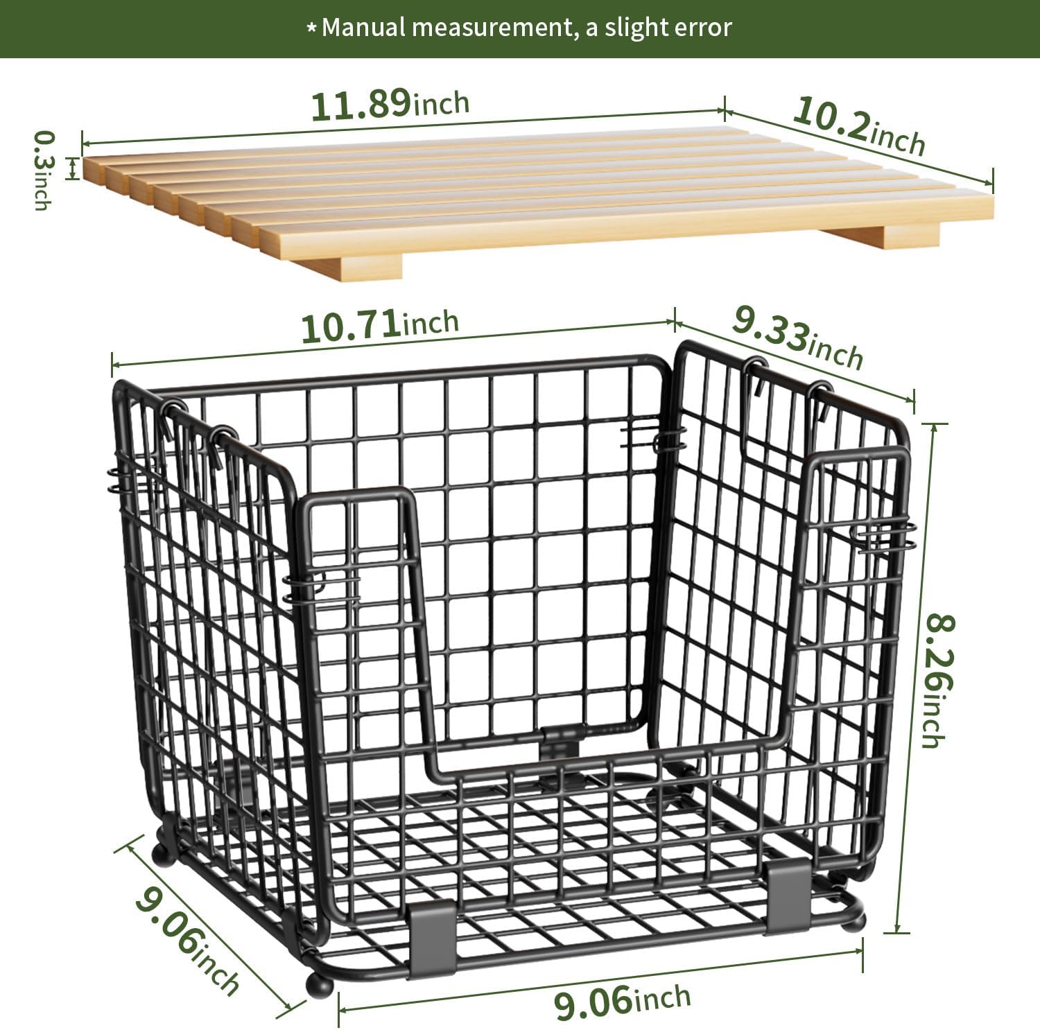 UPGRADED MATERIALS: The lid is made of 0.3in thick natural wood with high load-bearing capacity. The wire basket is made of premium carbon steel, known for its high strength and durability, matte finish by top food-safe powder, will not deform, fall off or rust. And the 4 non-slip feet design provides stability, it can be firmly stuck in the gap of the wood lid to avoid slipping off when stacked.