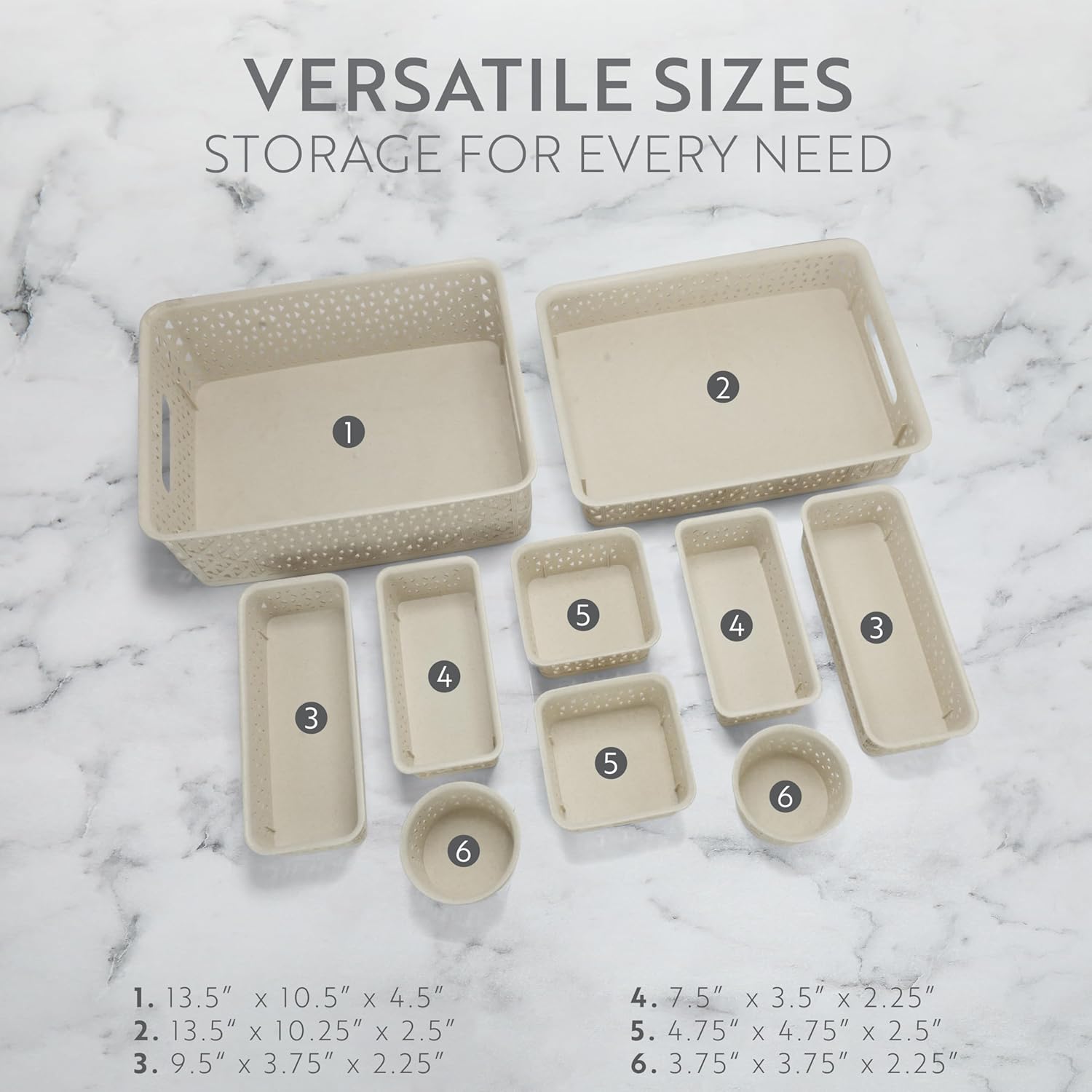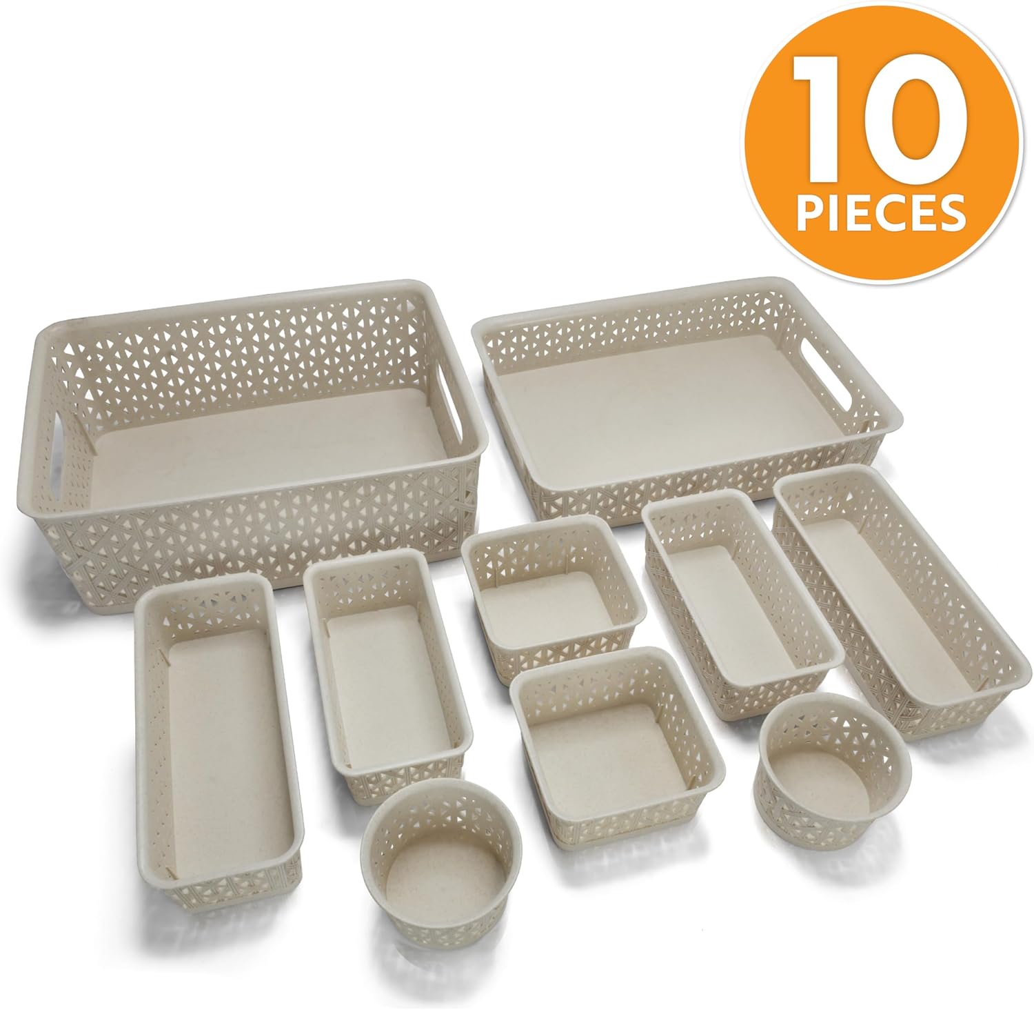 CUSTOMIZABLE ORGANIZATION – This 10-piece set includes nesting baskets that can be arranged in various combinations to fit your specific storage needs. Use them inside drawers for a tidy setup or display them on your vanity for easy access to everyday essentials.