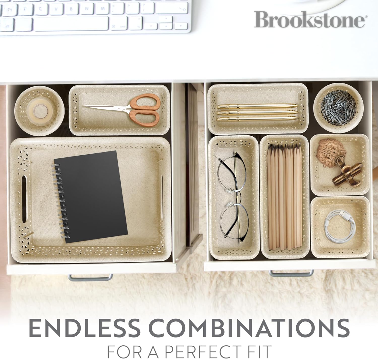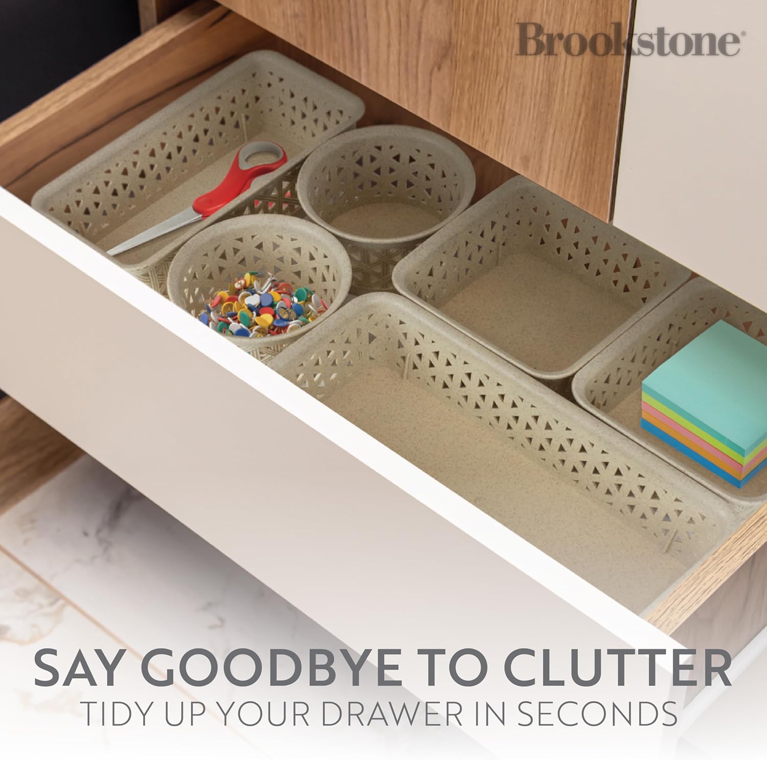 The Brookstone Multi-Purpose 10-Piece Organizing Set is the perfect solution for keeping your space neat and clutter-free. Designed with versatility in mind, these nesting baskets can be arranged in various combinations to fit your specific needs. Whether you’re organizing cosmetics, office supplies, kitchen essentials, or accessories, this set provides the flexibility to create a customized storage system. Use them inside drawers for a tidy, hidden setup or display them on your vanity for easy access to your everyday essentials. Made from eco-friendly materials, this set offers a sustainable yet stylish way to organize your home. The different shapes and sizes allow you to store a wide range of items efficiently, while the nesting design ensures compact storage when not in use. With a sleek and modern look, these baskets blend seamlessly into any decor, making them a practical and elegant addition to any room. Whether in the bathroom, bedroom, office, or kitchen, this organizing set helps you maximize space while keeping everything in its place.
