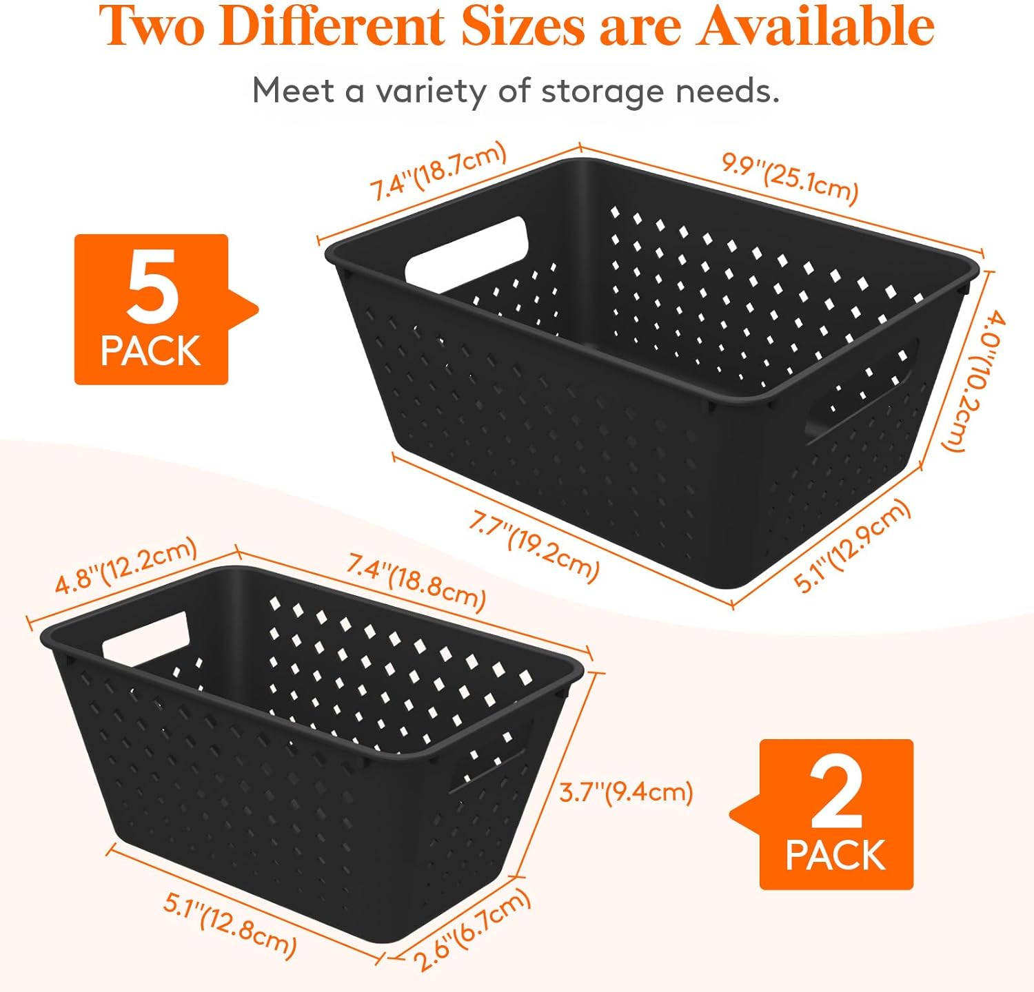 Two Different Sizes are Available: a set includes 7 storage bins of varying sizes, large size (5 pcs) 10.0″ * 7.5″ *3.9″ (25.4cm*19.1cm*10.0cm), small size (2 pcs) )7.4″ *4.8″ * 3.6″(18.9cm*12.3cm*13.0cm). These baskets cater to a wide range of storage needs, allowing you to freely combine and store different types of items.