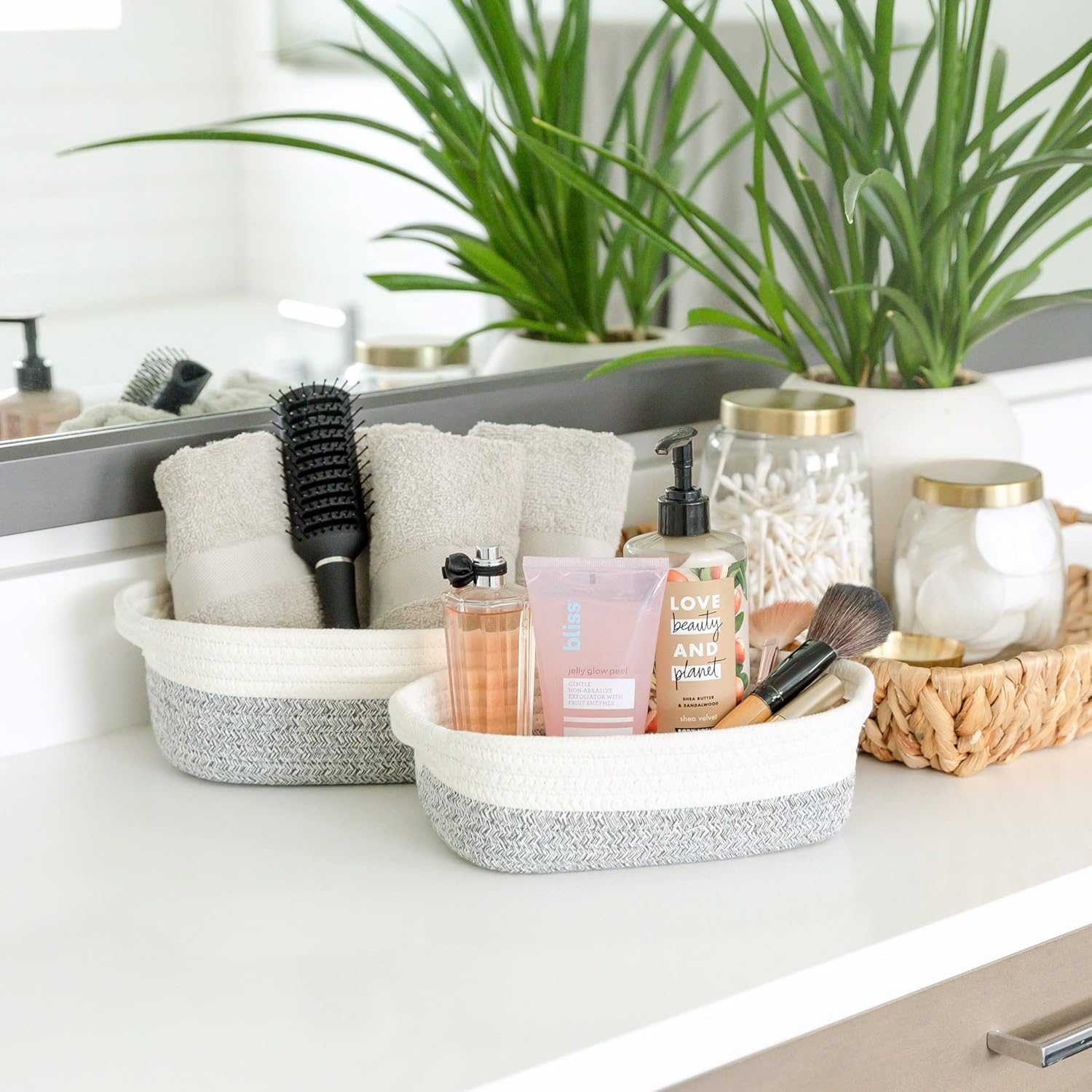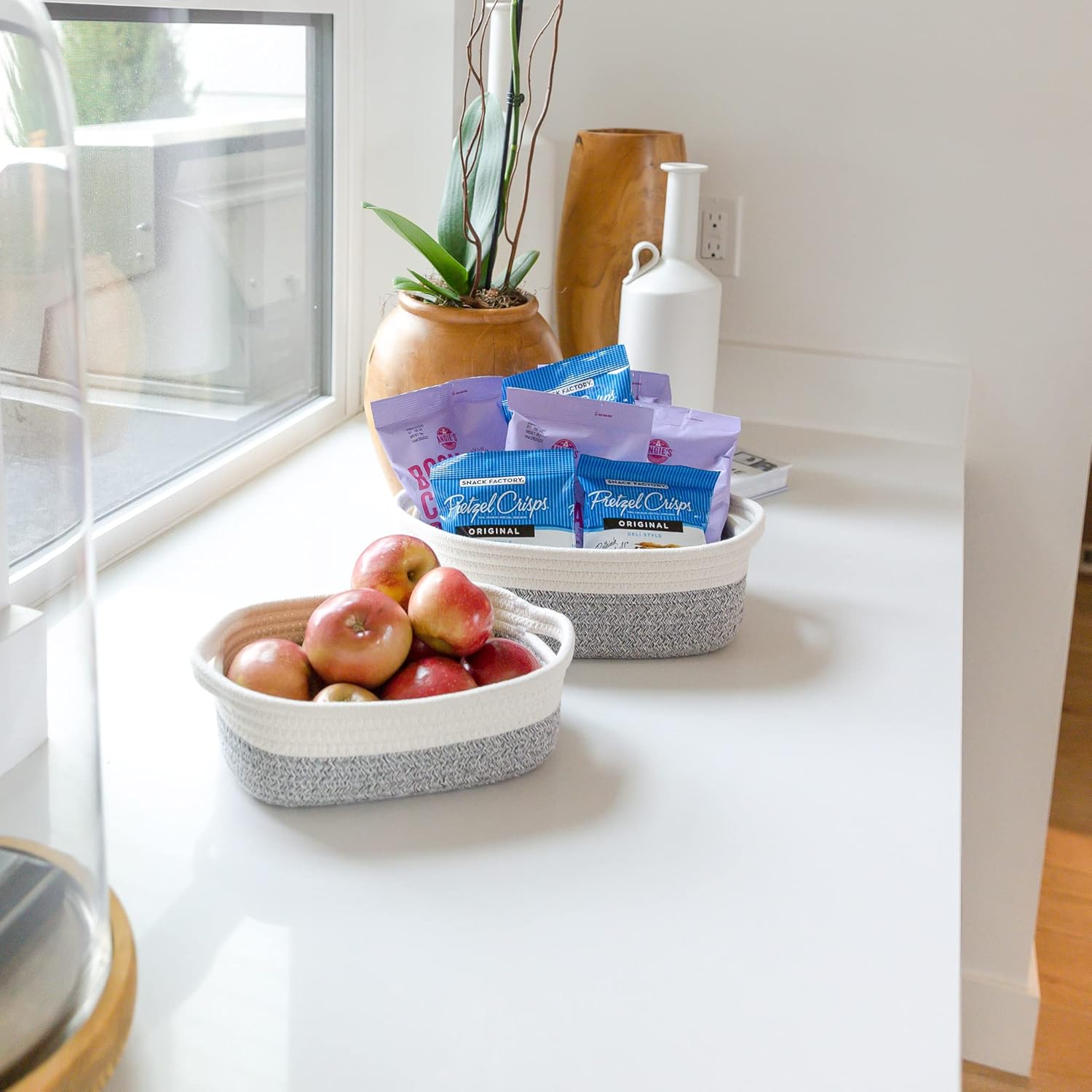 5 BASKETS FOR 5X THE ORGANIZING POWER: Life is messy…but your house doesn’t have to be! With 5 beautiful rope baskets for organizing, you’ll defeat messy rooms like a true supermom! Use the largest baskets for Montessori displays or countertop fruits holder, create the cutest dog toy storage or bathroom hand towel holder with the medium ones and stash jewelry or keys in the smallest. Biggest (11.8″x8.7″x4.3″), (11″x7.9″x3.9″), (10.2″x7.1″x3.5″), (9.1″x6.3″x3.1″), Smallest (7.9×5.5″x2.8″)