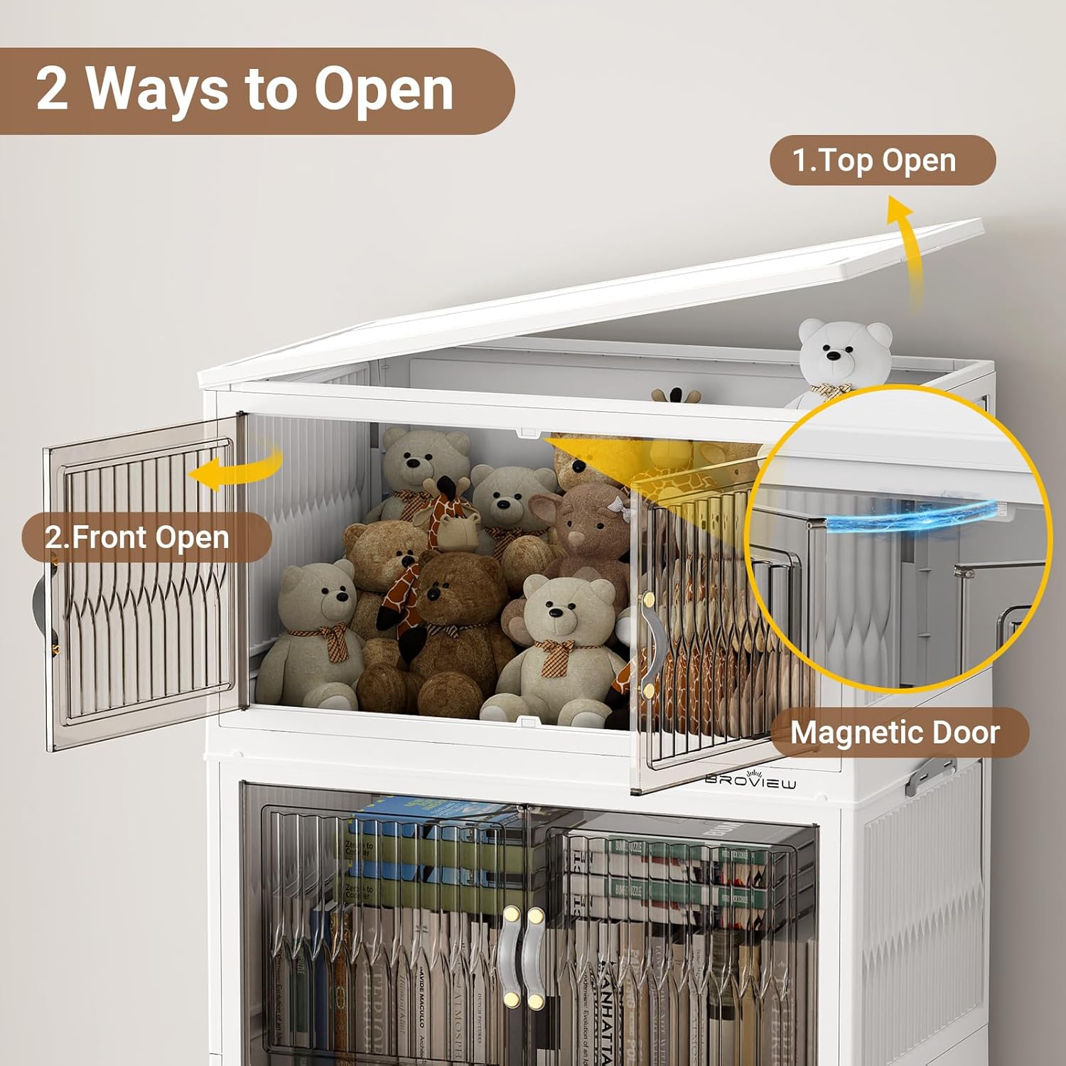 【Magnetic Front Open Doors & Wheeled】The large storage bins with doors provide two options: front doors opening or top lid opening. The brown door can be easily seen through and with a magnetic device. The 4x 360-degree rotating wheels all have fixed functions and can be easily moved by releasing the valve, making them friendly to the elderly.