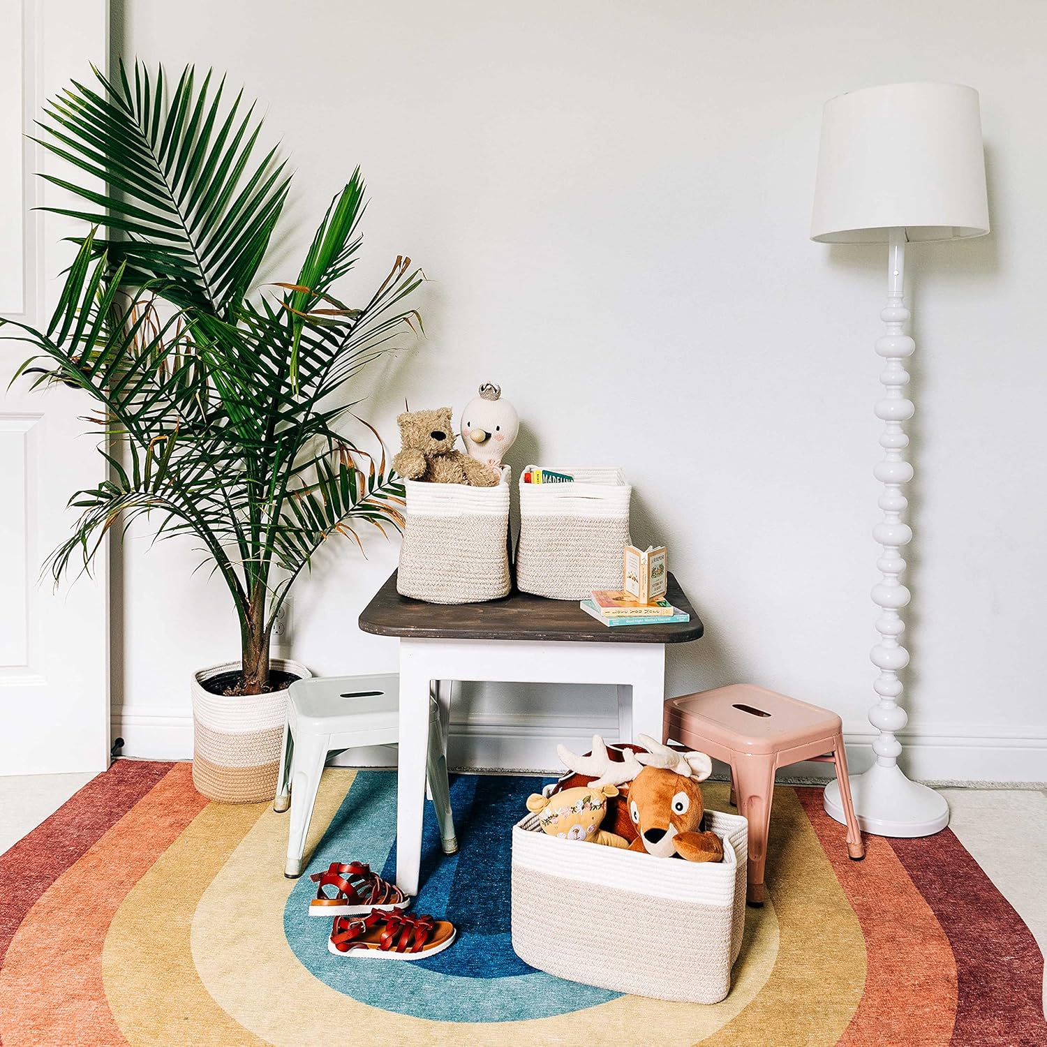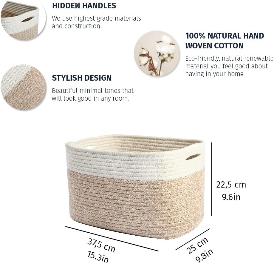 Discrete, Built-In Carry Handles – These fabric rope baskets for storage also feature slim hand holds built right into the sides of each round basket for a seamless look that’s also functional. Perfect for picking up toys or carrying items around the house.