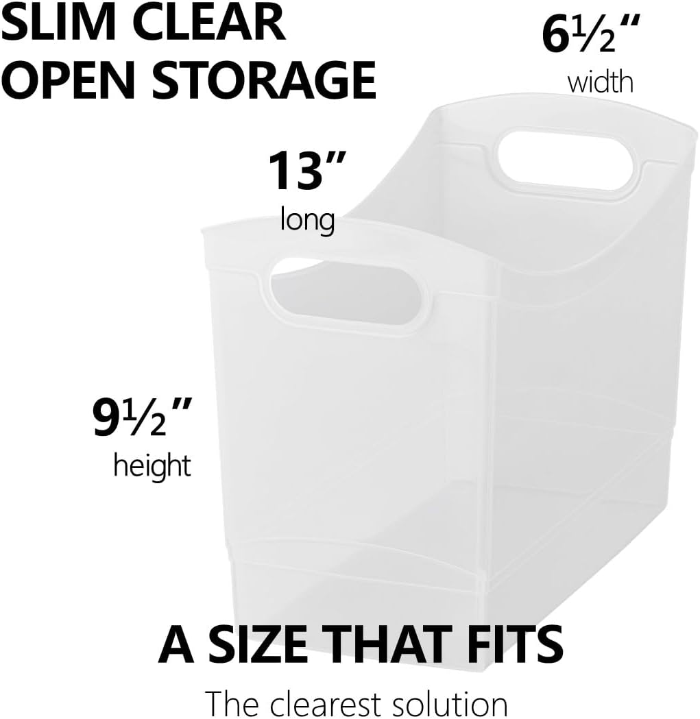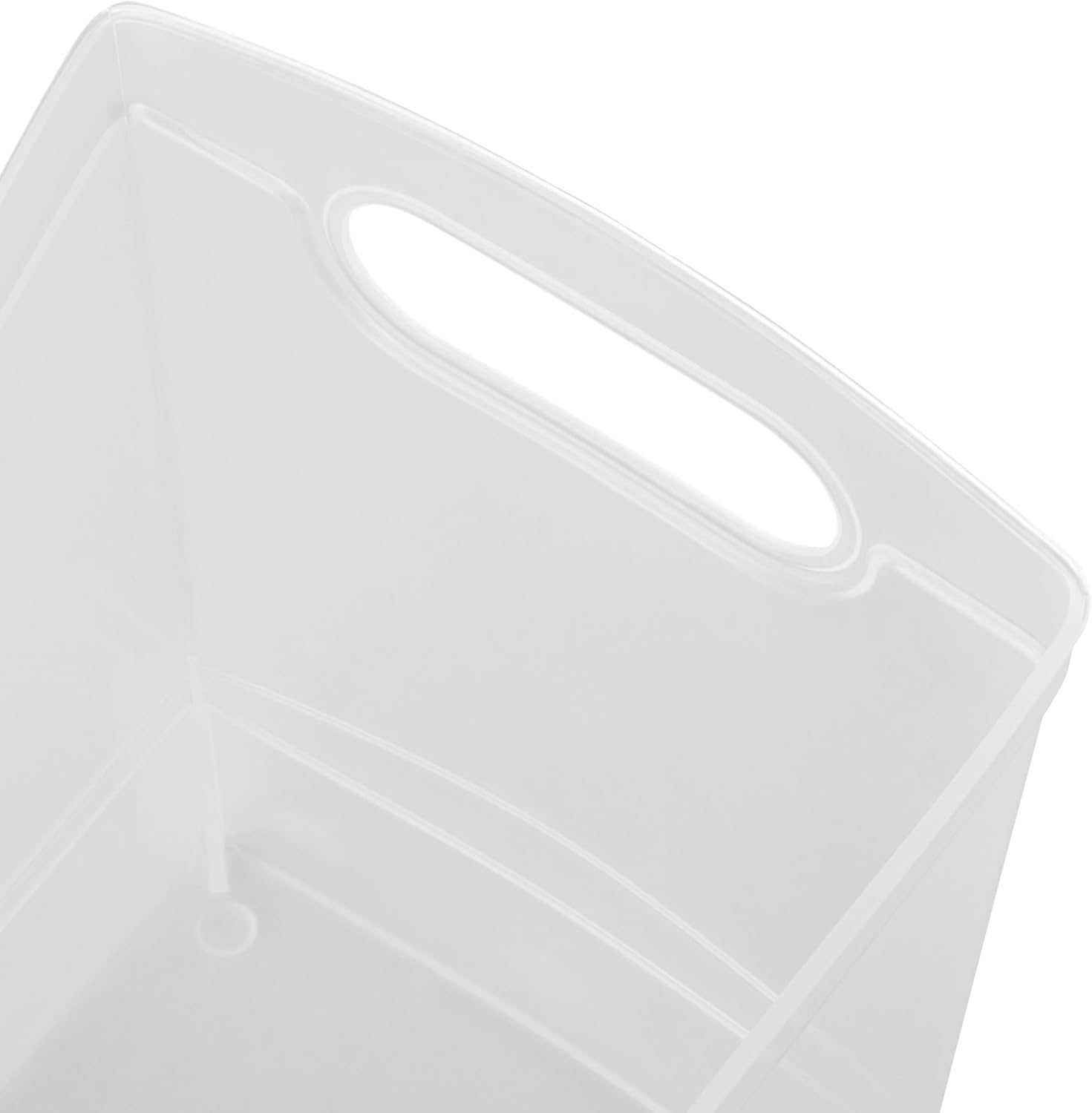 Storage Bins are a multi-purpose storage solution with a simple and classic style! The versatility of these bins allows them to be used in any room of the home – the bedroom, bathroom, dorm room, office, classroom, or playroom. Available in 4 convenient sizes, Storage Bins are perfect for closet organization, as they are specifically designed to fit on 16-inch wire shelving. The Short Storage Bin is ideal for storing anything from clothing, towels, and linens to craft items, office supplies and health and beauty items. The open design provides easy access for stored items and allows for quick clean up, while the carry-through handles make for effortless and comfortable transport. The sturdy, banded rim adds a stylish touch to the bins, while the modern, clear design works well with any home décor. The bins feature polished sides and a textured bottom that are both easy to clean. The overall assembled dimensions of this item are 13″ L x 9 1/4″ W x 6 1/4″ H.