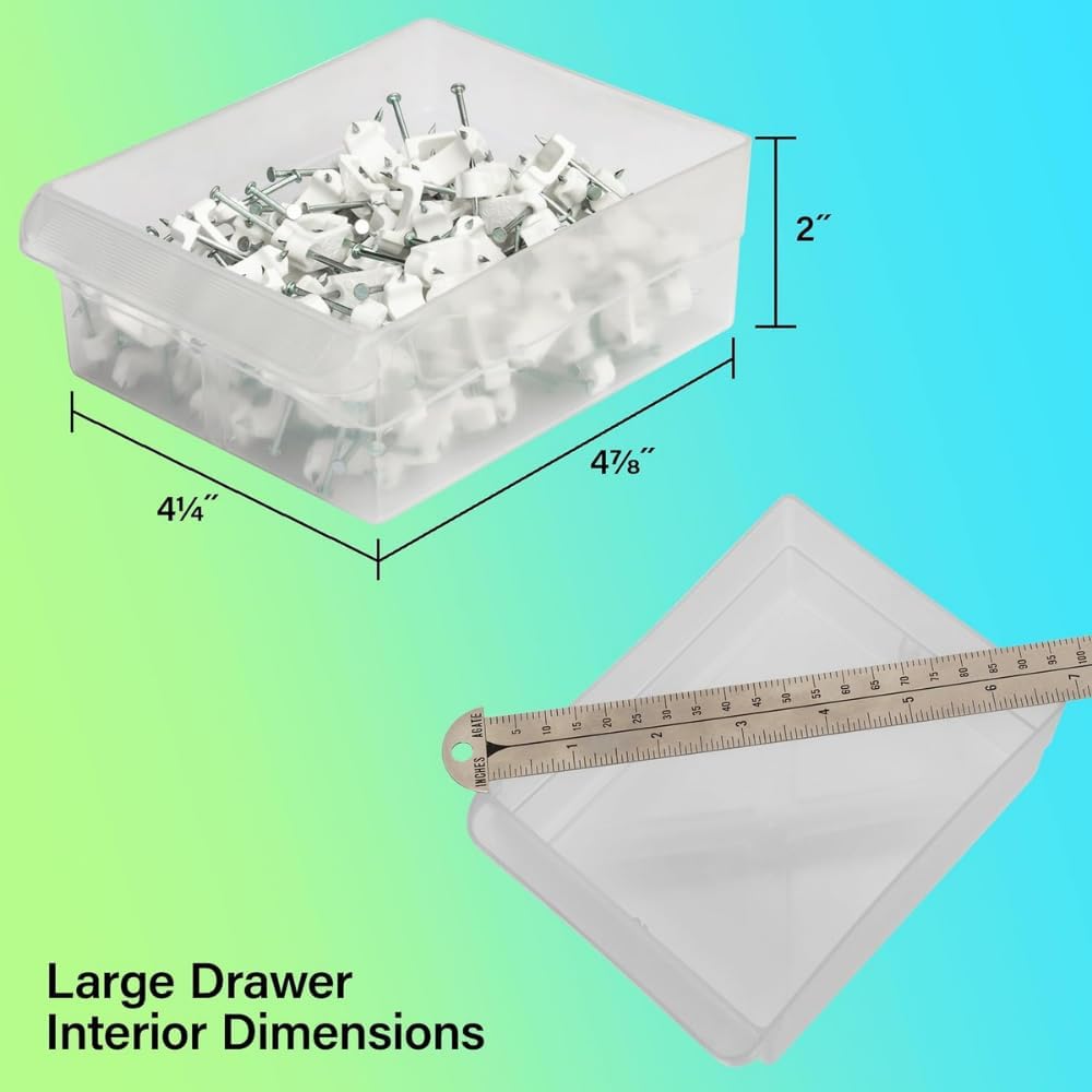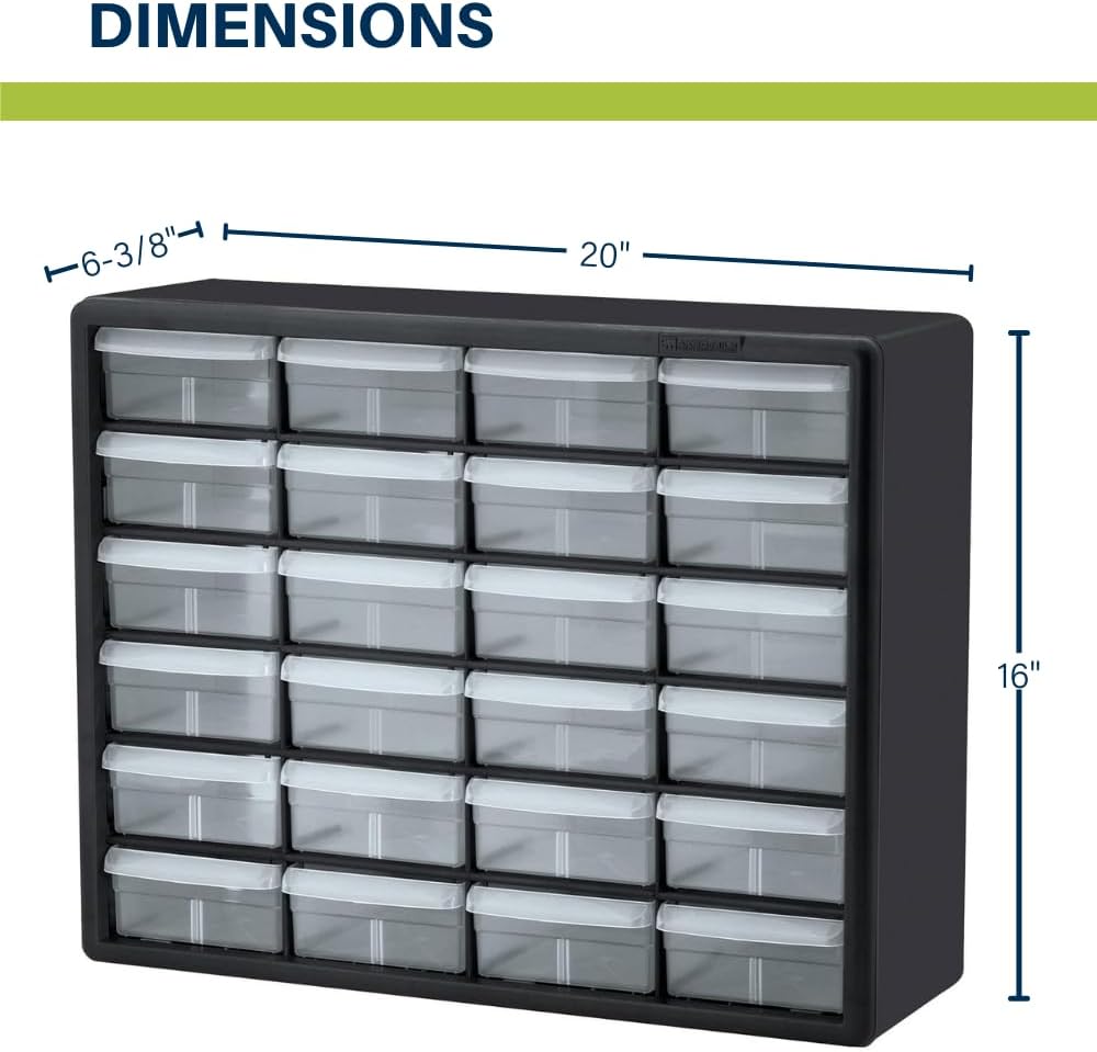 The Akro-Mils 10124 24-Drawer Plastic Storage Cabinet Organizer with Drawers is a great solution for all your storage needs. This heavy-duty cabinet is made in the U.S.A. from rugged, high-impact polystyrene plastic and features 24 large and small plastic drawers offering ample storage space for all your small parts and tools. Plastic organizer drawers inside dimensions: 4-7/8-Inch x 4-1/4-Inch x 2-Inch. Whether you’re looking to organize your garage, workshop, classroom, or home, this storage cabinet has you covered. Garage owners and businesses will love the versatility of this cabinet, with the plastic storage drawers perfect for use as a hardware organizer, screw organizer box, or for battery storage. Keep your nails and other small parts accessible with ease. Teachers can use the cabinet for classroom storage, as a teacher toolbox, art storage, craft storage box, for scrapbook supplies, and more. This plastic storage cabinet is also perfect for home storage and organization. Use it as a lego organizer, craft organizer, hobby organizer, or bead storage organizer. It’s even great for makeup storage and organization or for medicine and first aid supplies. And with the ability to stack cabinets securely or wall-mount them using keyhole slots, along with finger-grip drawer pulls and rear stop tabs to prevent contents from spilling, this cabinet has everything you need to keep your items safe and organized. Cabinets have 8 small crosswise dividers and 4 large length dividers included. Included dividers are molded into the back of the cabinet (remove with scissors). Additional dividers can be purchased separately.