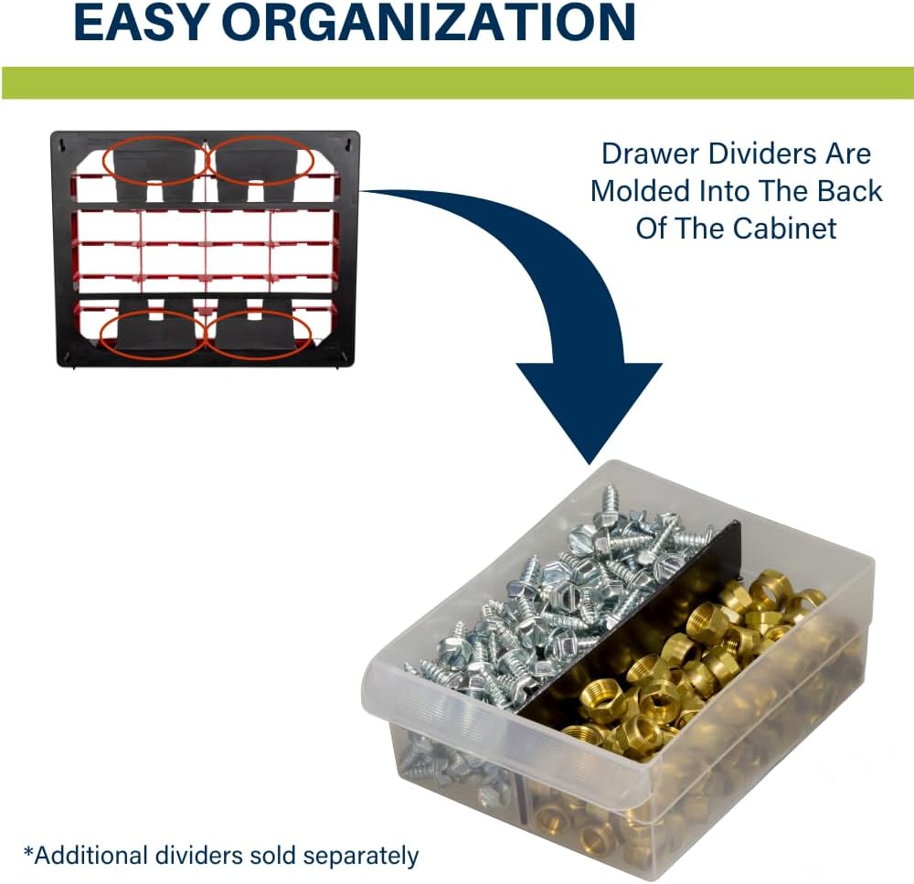 FEATURES: Stack cabinets securely or use keyhole slots to mount for wall storage; Finger-grip drawer pulls provide easy access; Rear stop tabs prevent contents from spilling; Drawer dividers are included and molded into the back of the cabinet