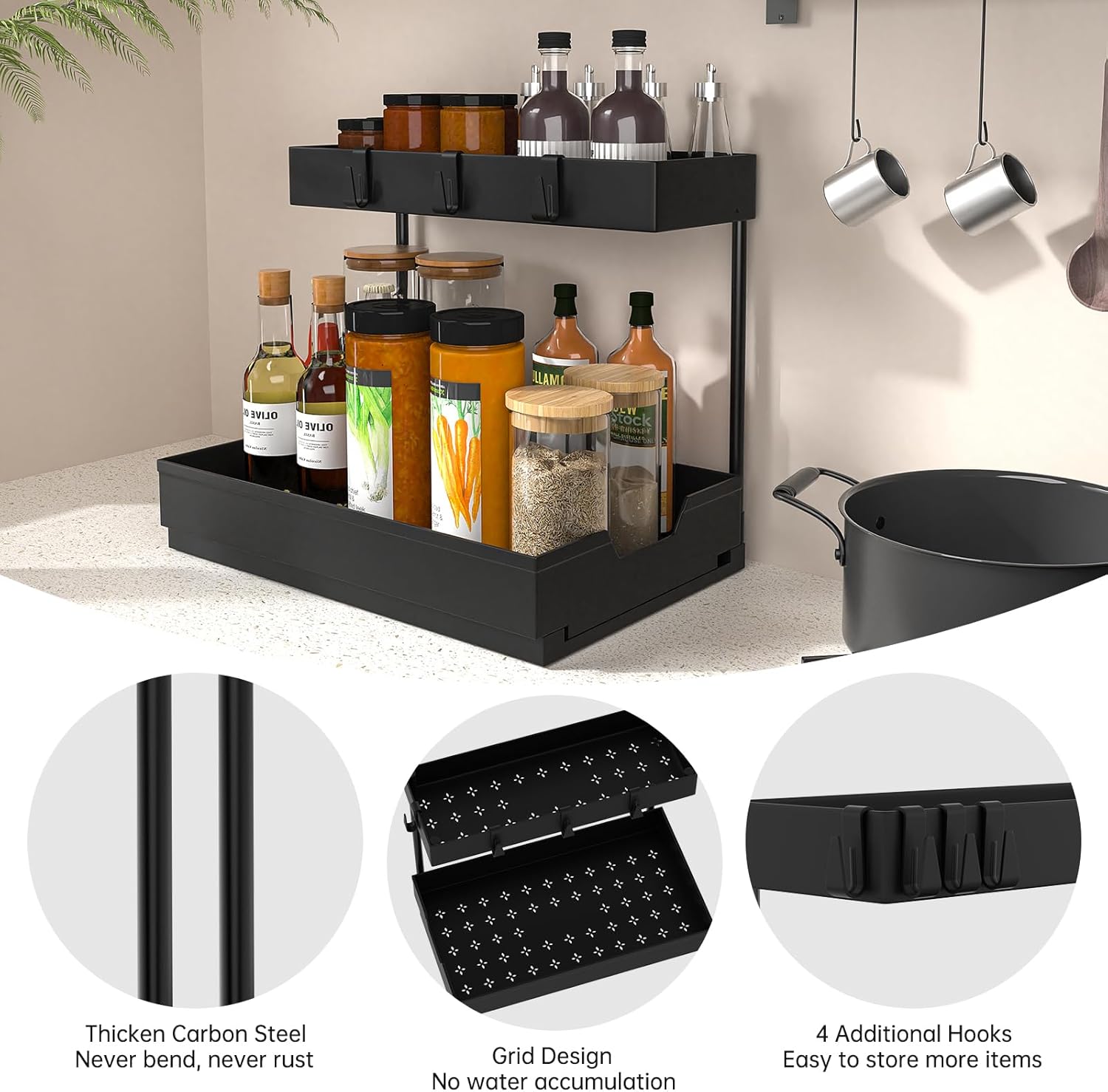 Easy to Install and Clean, no tools are needed and it only takes a few seconds to install this slide out cabinet organizer, the sink shelf is grid design to prevent water accumulation, also effortless to clean, simply wipe the surface with a damp cloth