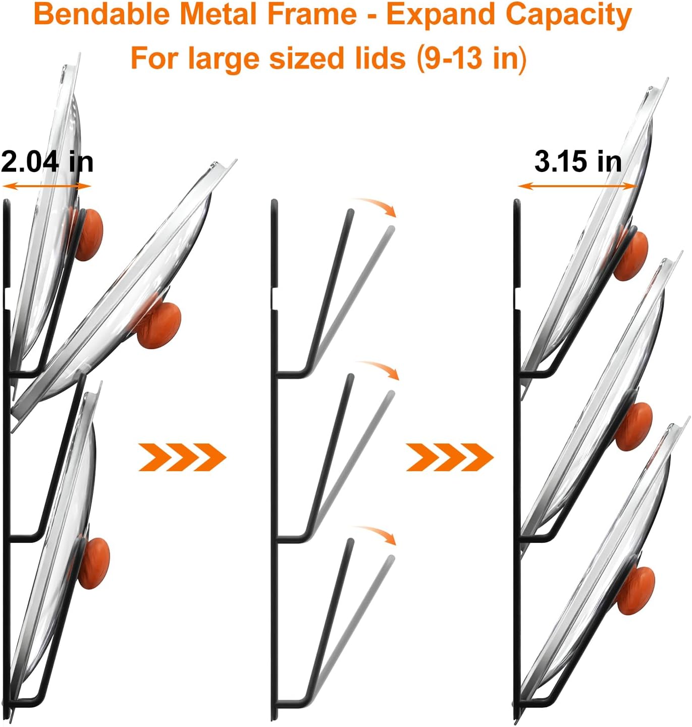 NOTE: While the lid rack is bendable to fit large sized lids, but please DON’T excessively bend the lid rack to fit large pot lids, otherwise the lids rack may stick out too much and the cabinet door may not close.