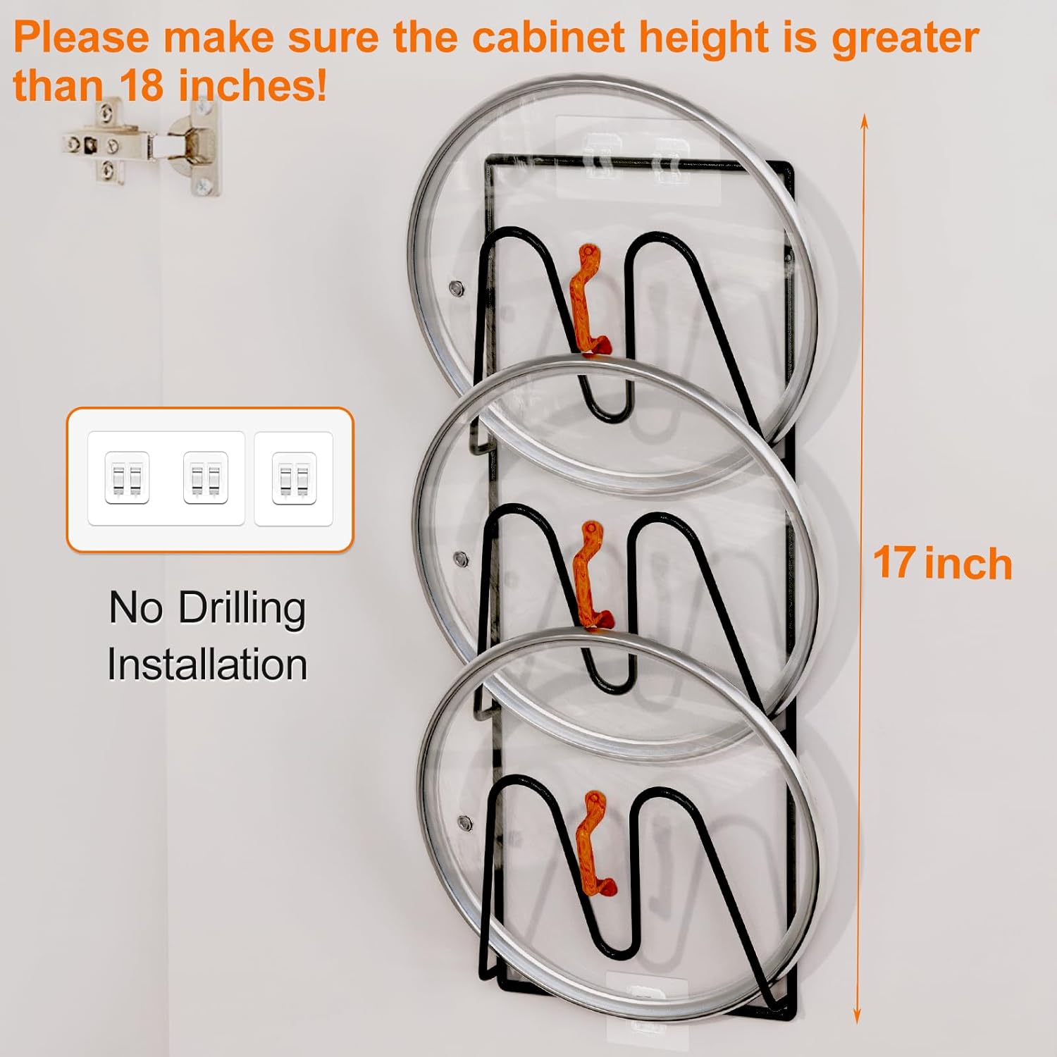 Sturdy & Rustproof: The pot lid organizer is made of high quality with black powder coating on the surface, making it stronger and not easily deformed, and smooth surface to protect the pot lid surface and prevent scratches.