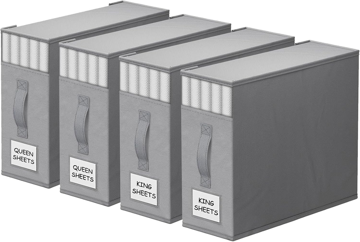 Customers find the storage boxes excellent for organizing linen closets and appreciate that they fit four king-size pillowcases while taking up minimal space. They are easy to use, functional, and consider them worth the money. The material quality receives mixed feedback, with some praising the quality while others note the material feels like cheap cardboard. The zipper quality also gets mixed reviews.