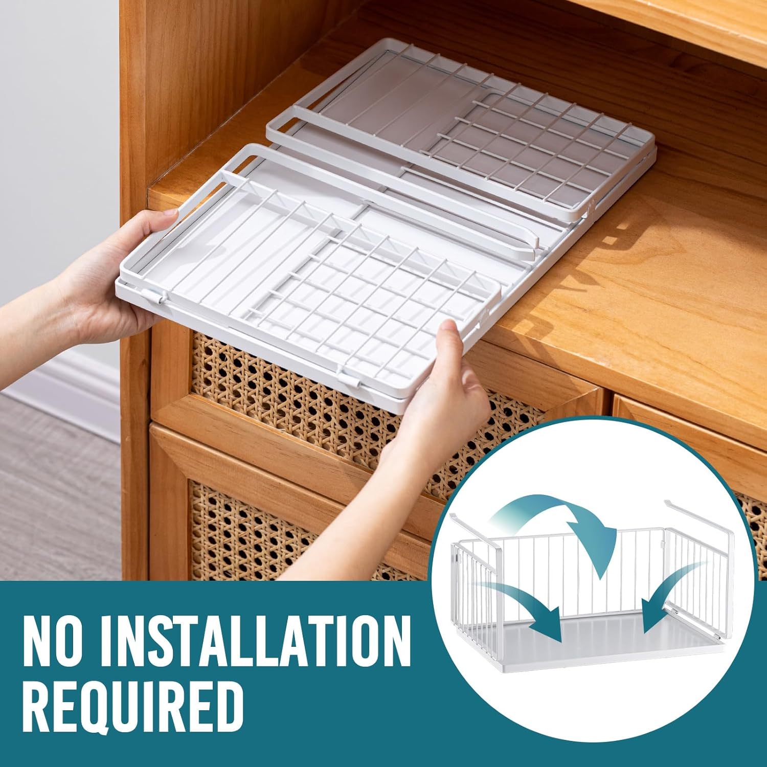 Innovative Foldable Design: Experience flexibility and convenience with our unique foldable design. Unfold or fold as needed, taking up no extra space. No tools required – simply unfold and slide onto an existing shelf to instantly increase storage capacity