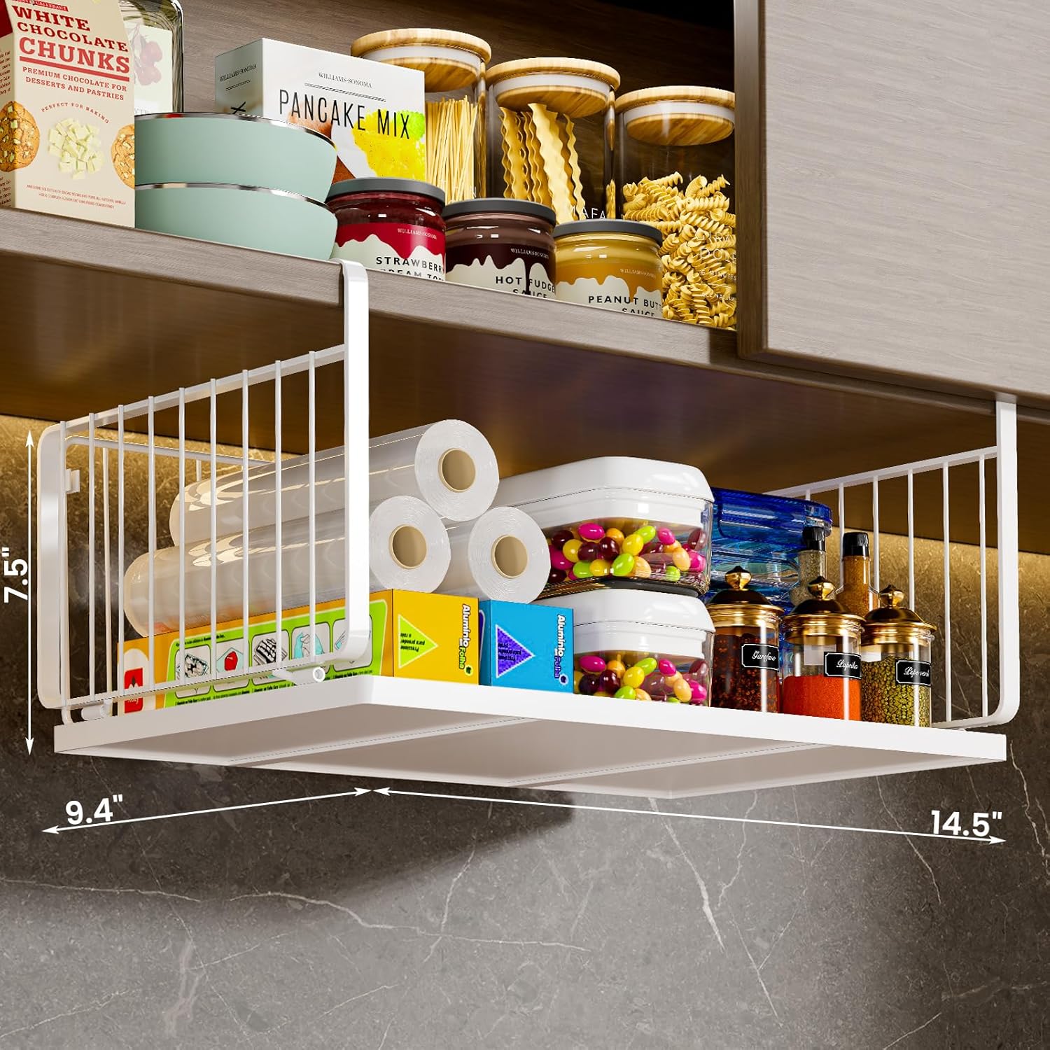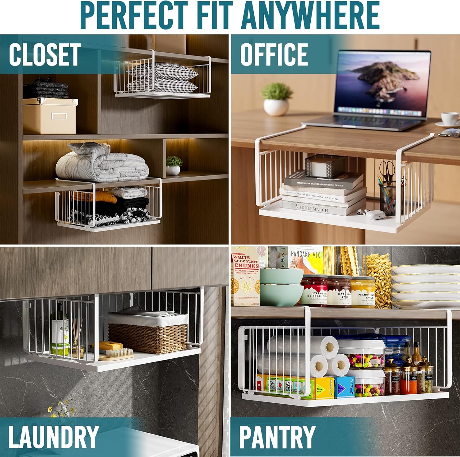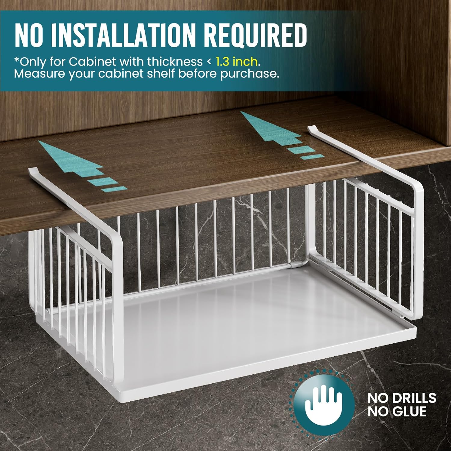 Durable & Convenient: Sturdy grid design for visibility and easy access. Each under shelf storage holds up to 30 lbs with a high-quality coating. Durable, reliable, and rust-proof, making it easy to find what you need. Great structure with metal plate and thickened hanging arms for stability. Multi-functional as a mobile drawer organizer or expanded cabinet organizer