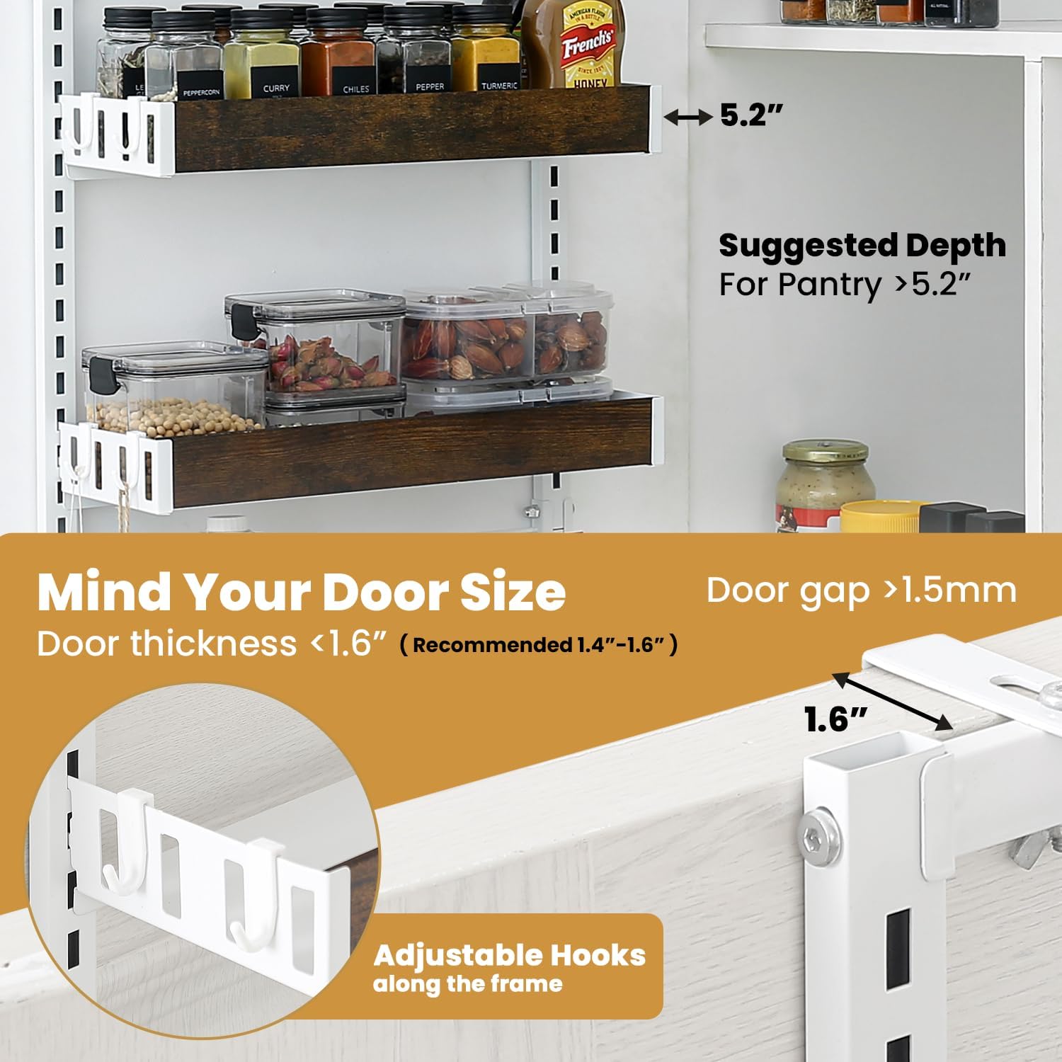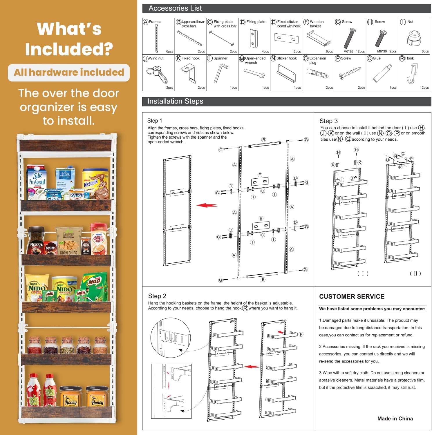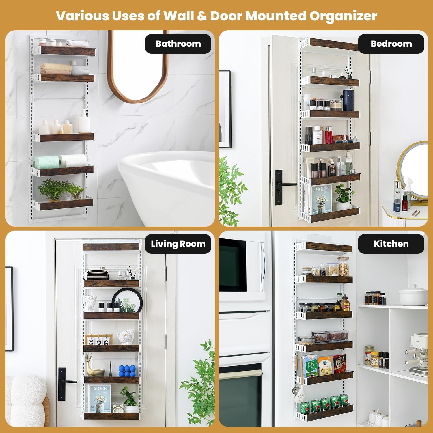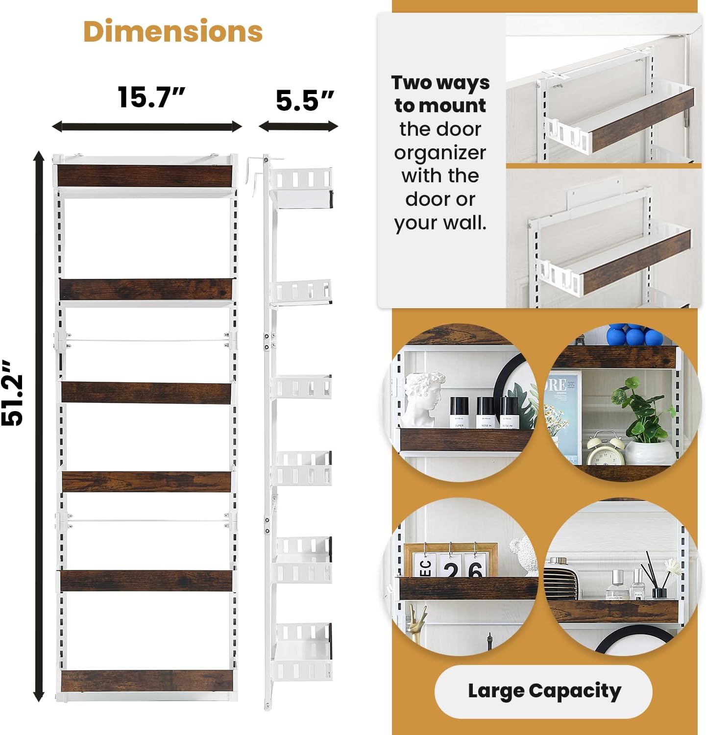 This 6-tier pantry organizer and storage door shelf is crafted from sturdy wood and an iron frame, offering a durable and stylish addition to your kitchen, bathroom, or closet.