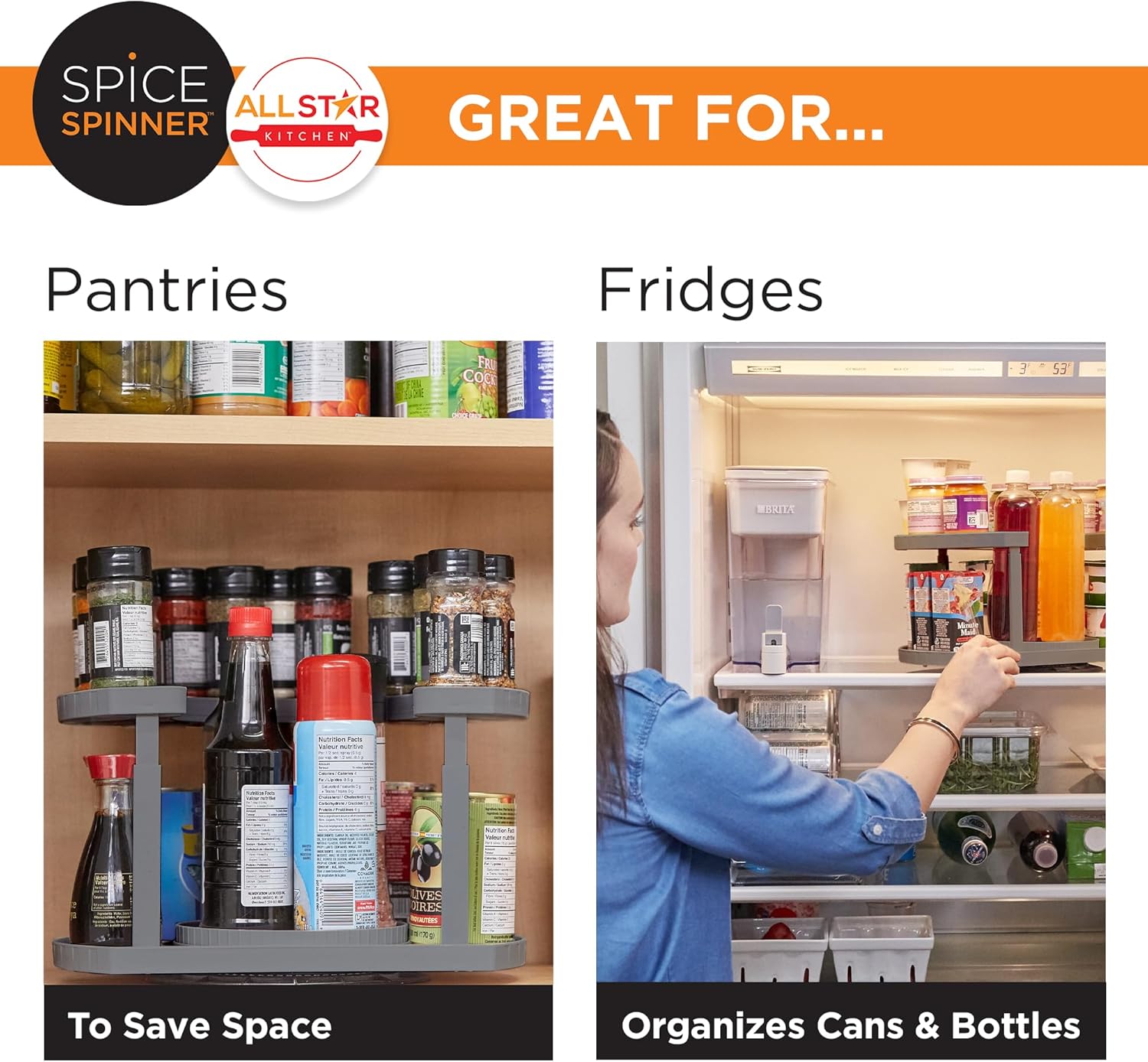 Maximize storage space in the kitchen, pantry, or bathroom with this Stow-n-Spin two-tier turntable organizer. Gain easy access and a rotating view of spices, cans, bottles, and other items that get buried in the back of cabinets and shelves. From Stow-n-Spin.