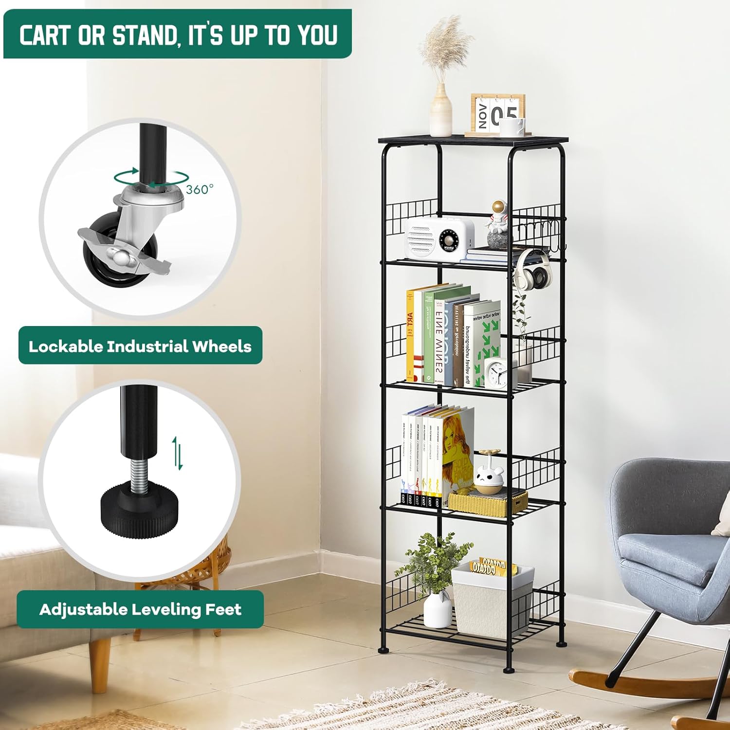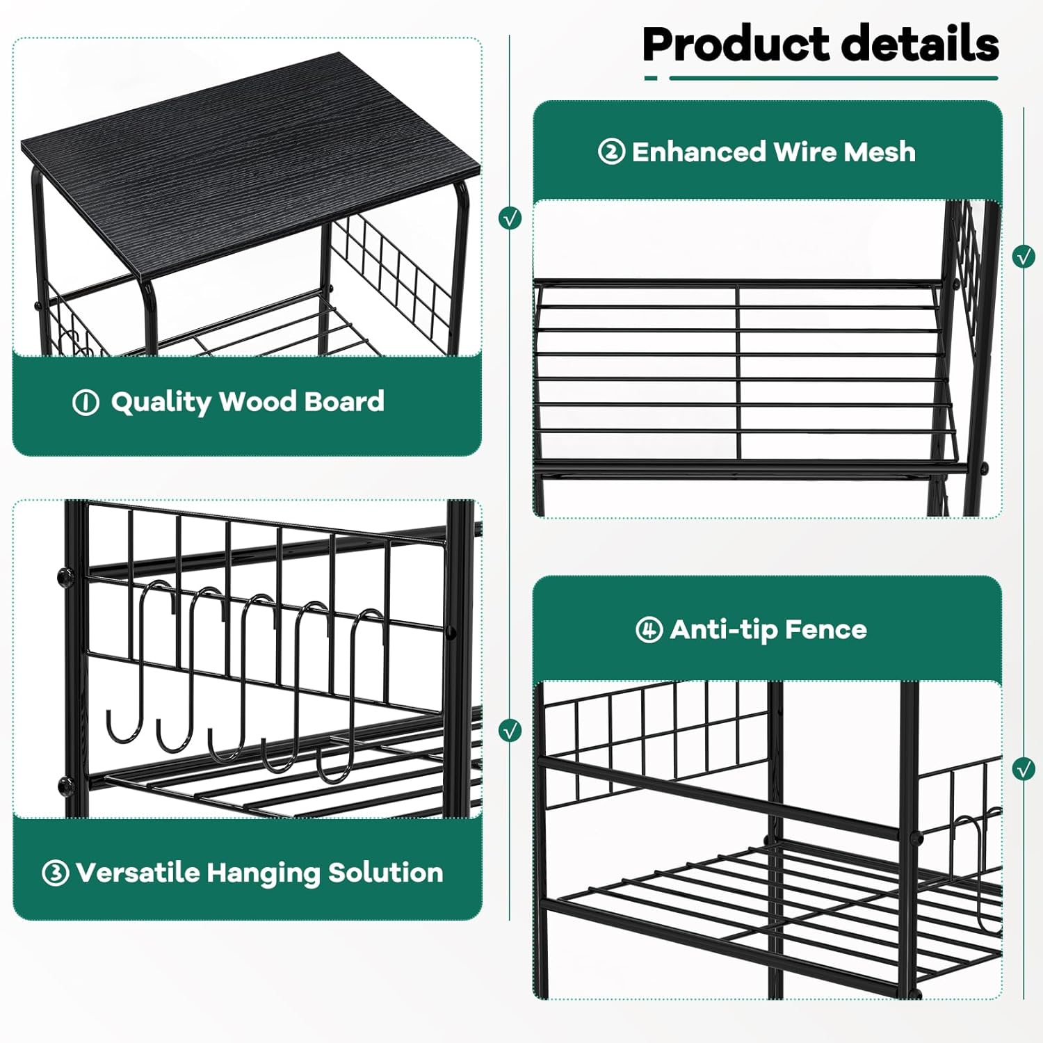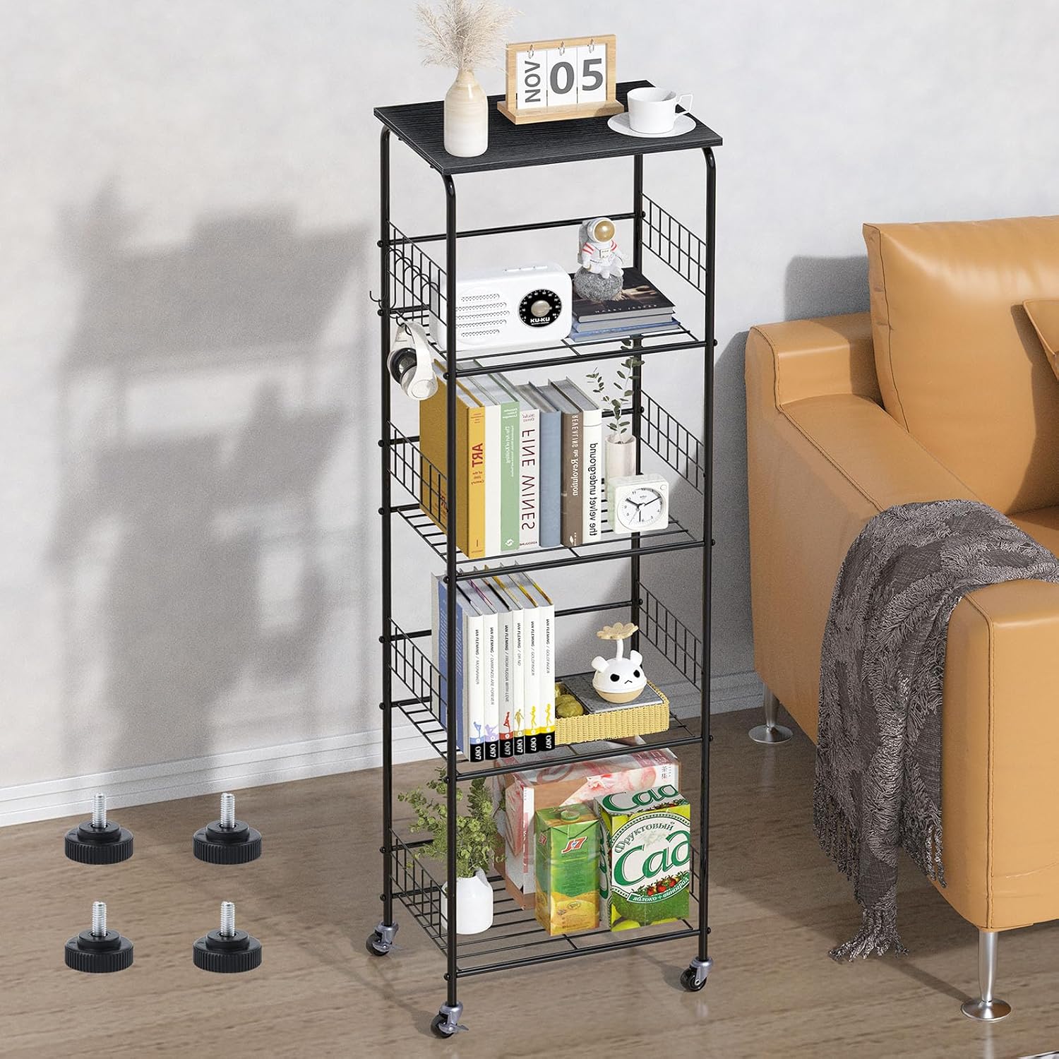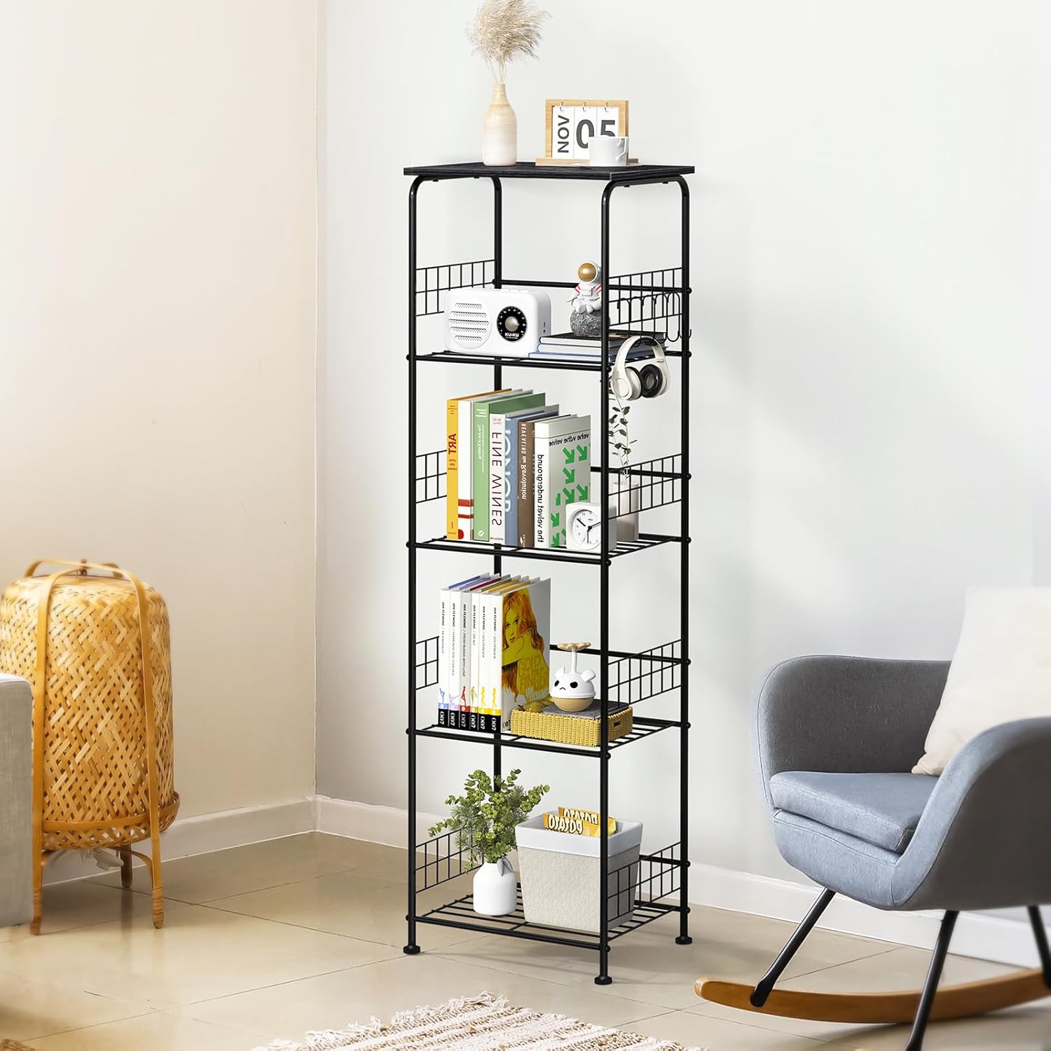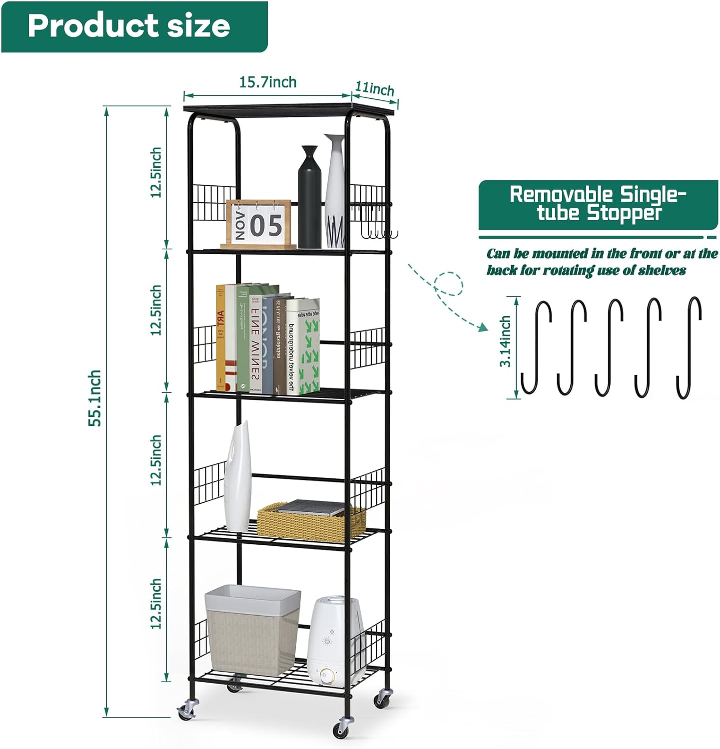 【Large Capacity】 Featuring 5 spacious tiers, these metal storage shelves offer generous storage space. Each layer has a sufficient load-bearing capacity to hold large or heavy items such as a microwave oven, rice cooker, or juicer in the kitchen. The all-direction mesh border on each tier prevents items from dropping off, and the side bars not only reinforce the structure but also add an aesthetic touch. The overall size of 15.75*11.02*55.31 inches makes it suitable for narrow spaces or room corners.