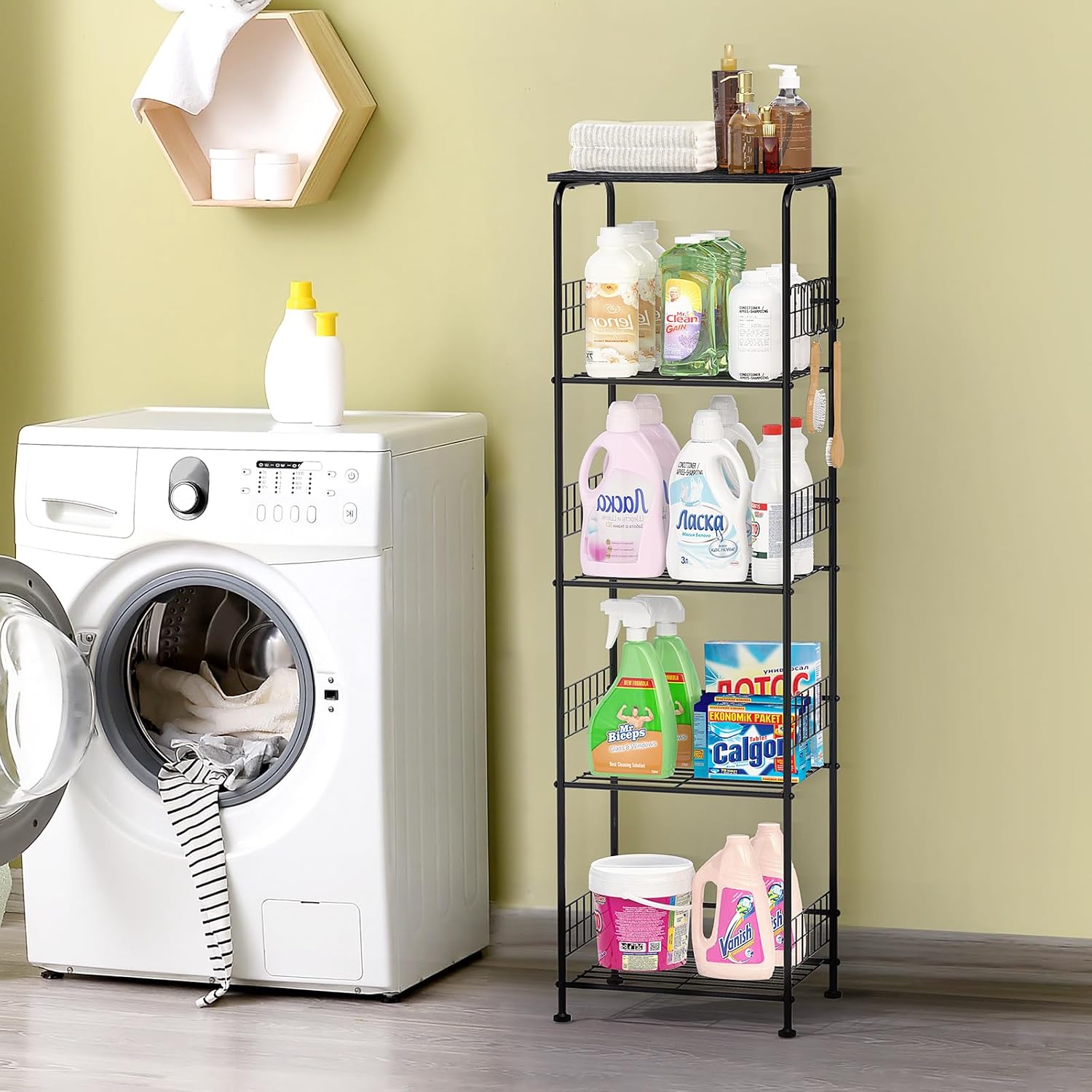 【Sturdy and Durable】 Built with a heavy-duty metal iron frame, this bathroom shelves free standing is extremely sturdy. The 5 tier structure provides reliable support for all your items. The top is equipped with a wooden board, adding extra stability. The finish of the metal resists water, rust, and corrosion, ensuring long-lasting performance. Even in harsh environments like garages or laundry rooms, it can maintain its integrity and functionality over time.