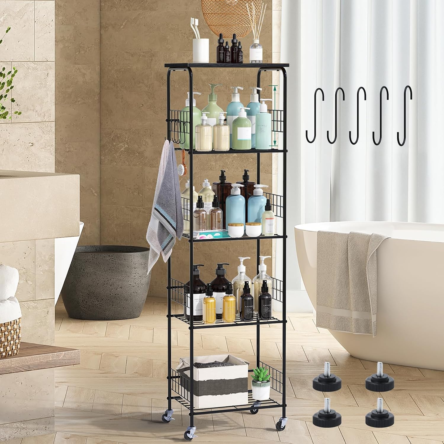 【With Feet & Wheels】 Equipped with both 4 adjustable leveling feet and 4 caster wheels, our bathroom shelving units offers the best of both worlds. The adjustable feet ensure the unit remains stable on slightly uneven floors, protecting your floor from scratches at the same time. Meanwhile, the 4 caster wheels allow for easy maneuvering, enabling you to move the storage rack to any desired position effortlessly. Additionally, we provide anti-fall straps for added safety, especially when using the rack in areas where stability is crucial.