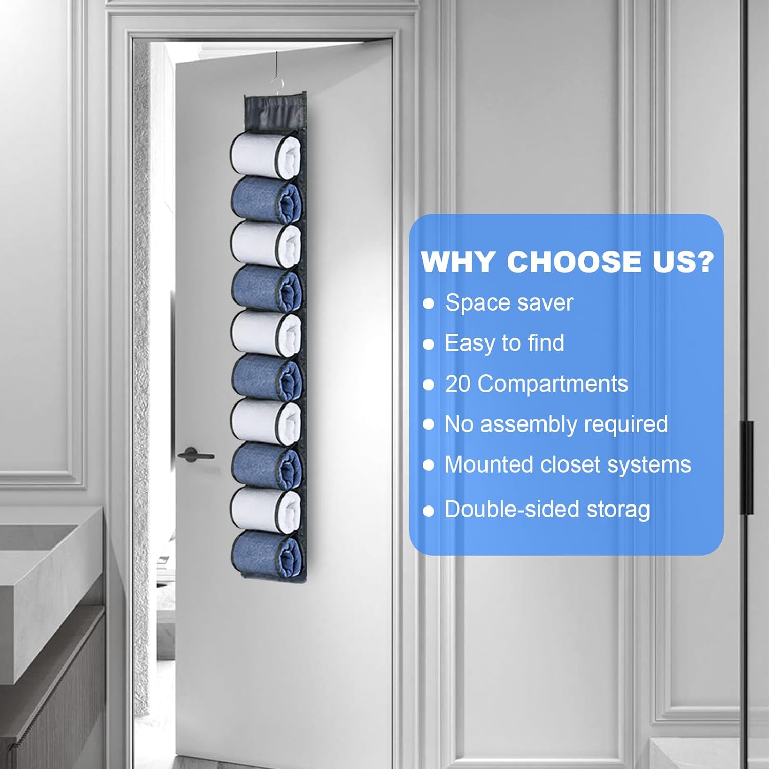 【MAXIMIZE STORAGE SPACE】Legging Organizer Hanging Legging Storage Organizer is designed to maximize storage space in your closet. With 20 big pockets There are 10 folds on each side, it provides ample room for storing your leggings, yoga pants, jeans, and more. Hang it behind the door, in your wardrobe, or on a hanger for convenient and organized storage.