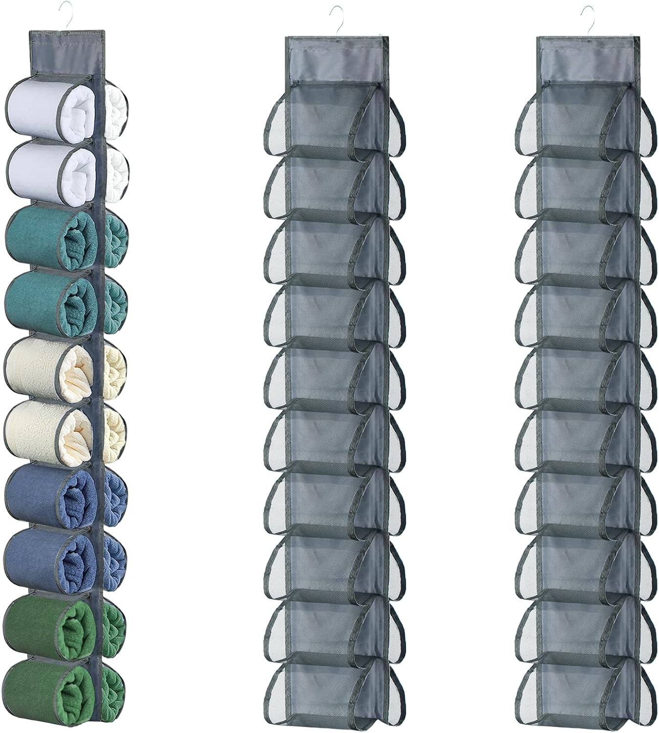 Hanging Legging Organizer – the solution for organizing ! With 20 pockets in total, 10 on each side, The ultimate solution for decluttering your closet and organizing your leggings, yoga t-shirts, sports bras, socks, pants, vests, and towels!