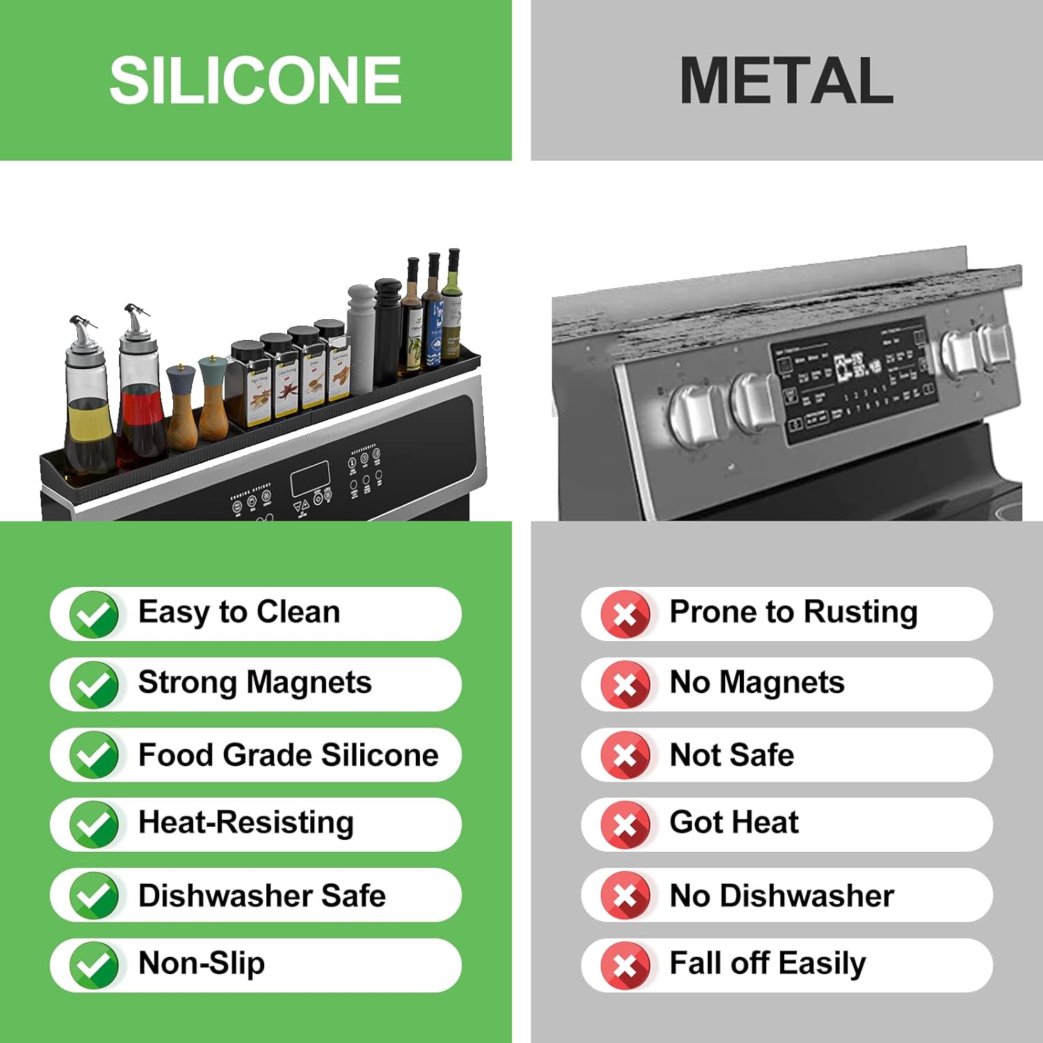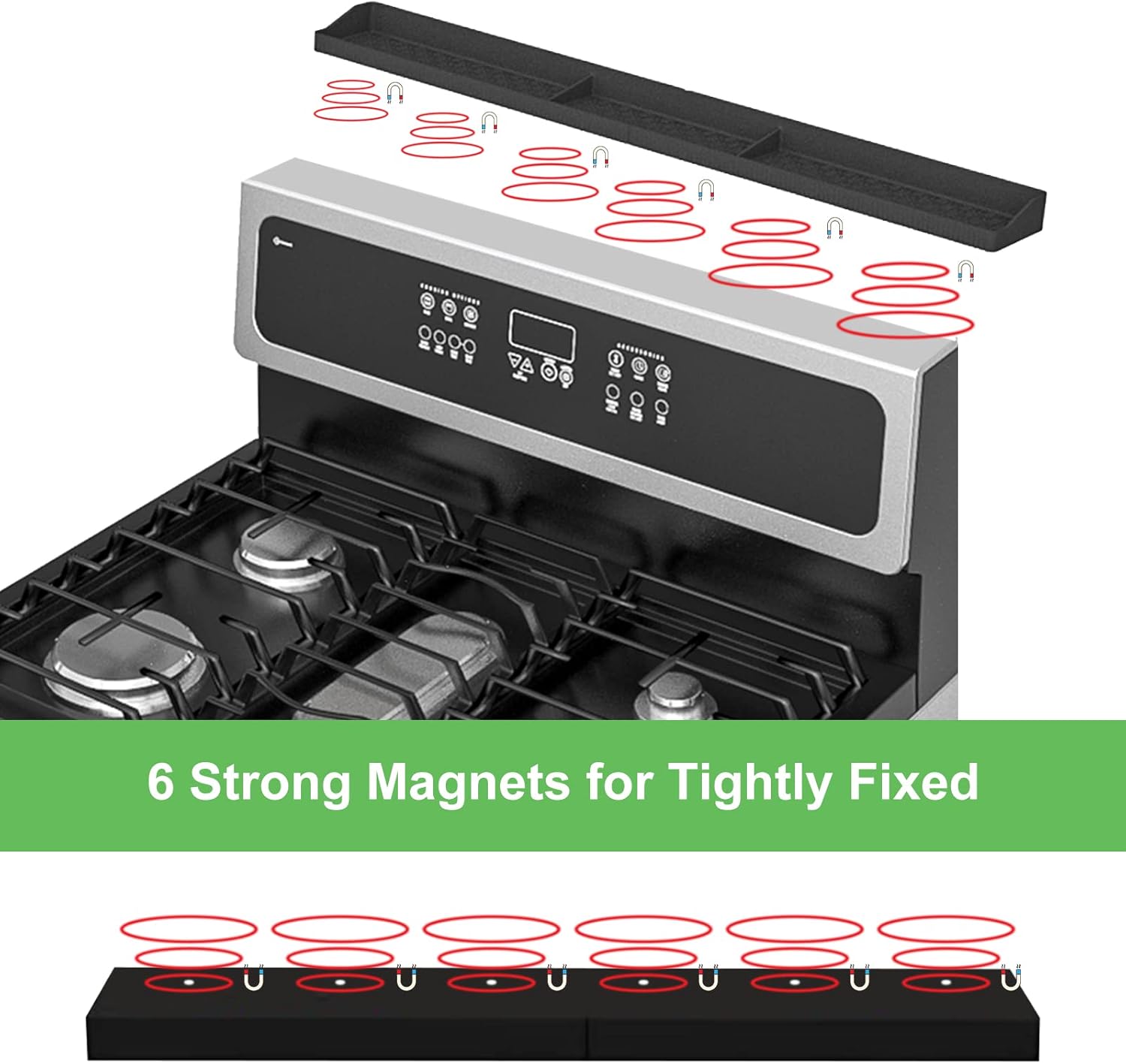 6 Strong magnets cover the entire back area to ensures it stay in place, your stuff won’t fall down to the stove and helps block things from falling behind the stove.