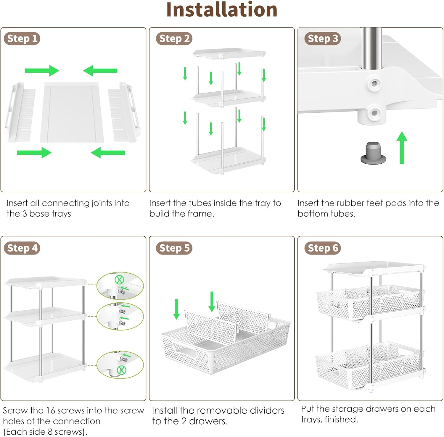 [Robust Build & Convenient Features] – Crafted sturdy high-hardness ABS plastic, our under sink organizer non-toxic, odorless. Thickened stainless steel support tubes, secured by screw reinforcement, provide reliable stability, double reinforced, it won’t fall apart even if dropped. The organizer features 2 pull-out basket drawers featuring a weaved moisture-proof design, hollow-out handle for effortless access to stored items. The bottom is equipped with anti-slip rubber feet pads, ensuring stability and preventing scratches or movement.