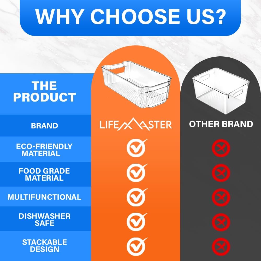 Lifemaster Multi-Purpose Refrigerator Bins – 6 Pieces Usable And Stackable Design Fridge Bin Organizer With Easy Grip Handles – Clear