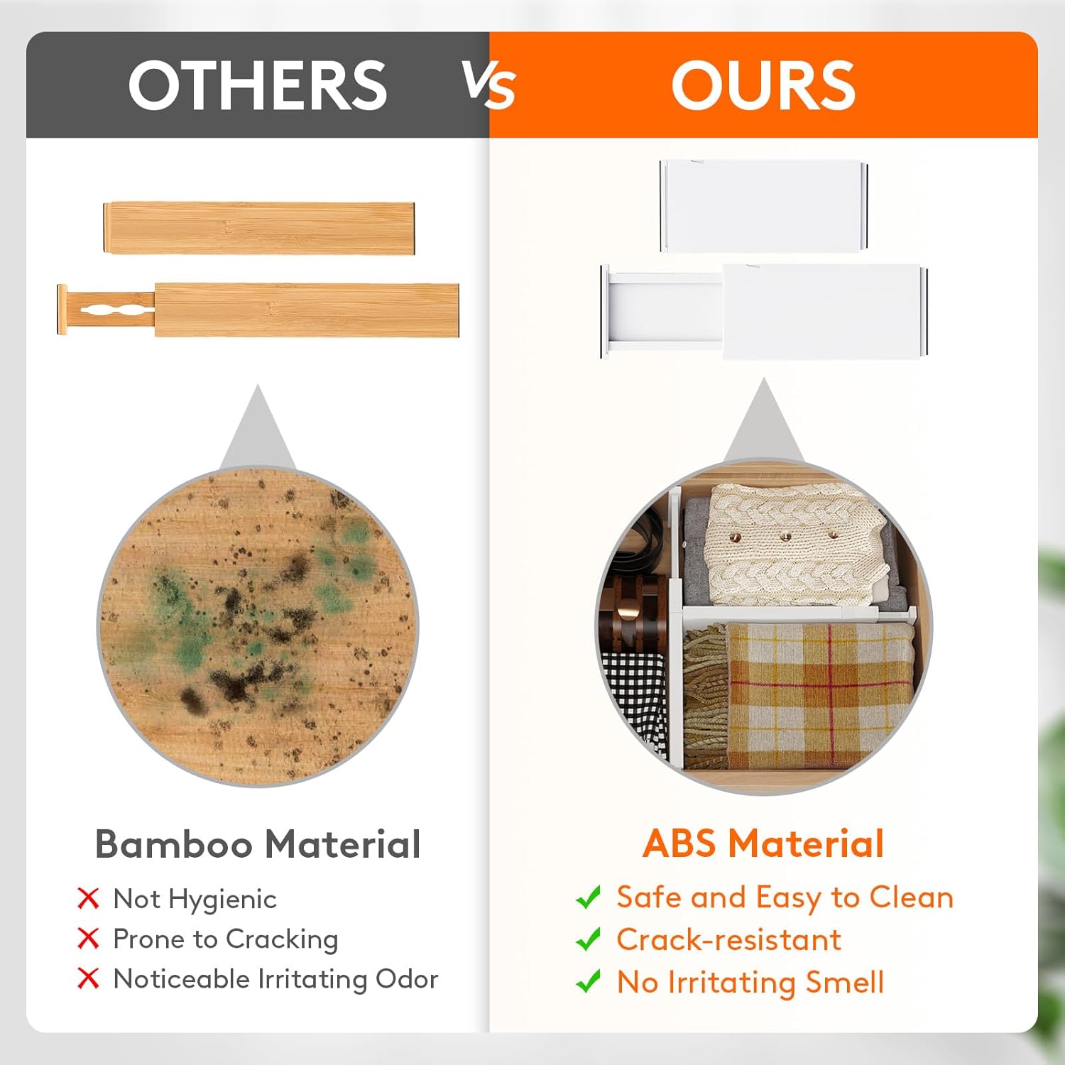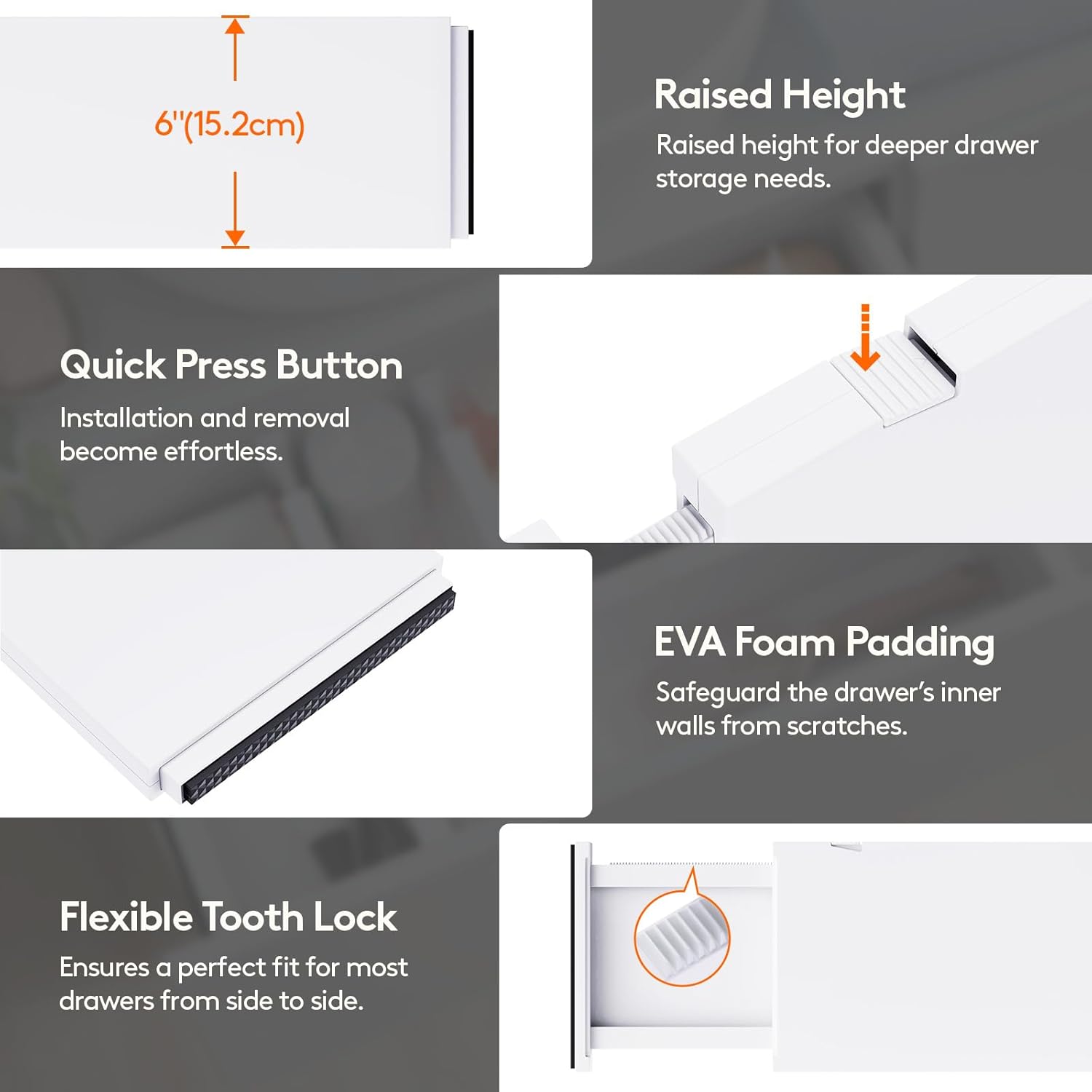 Sturdy Construction: Made of robust ABS material, our dresser organizer features EVA foam sponges on the ends to prevent scratches and damage to your drawer’s interior, ensuring a clean and stable fit without residue; Our divider is patented (Patent No: US12133593B2)