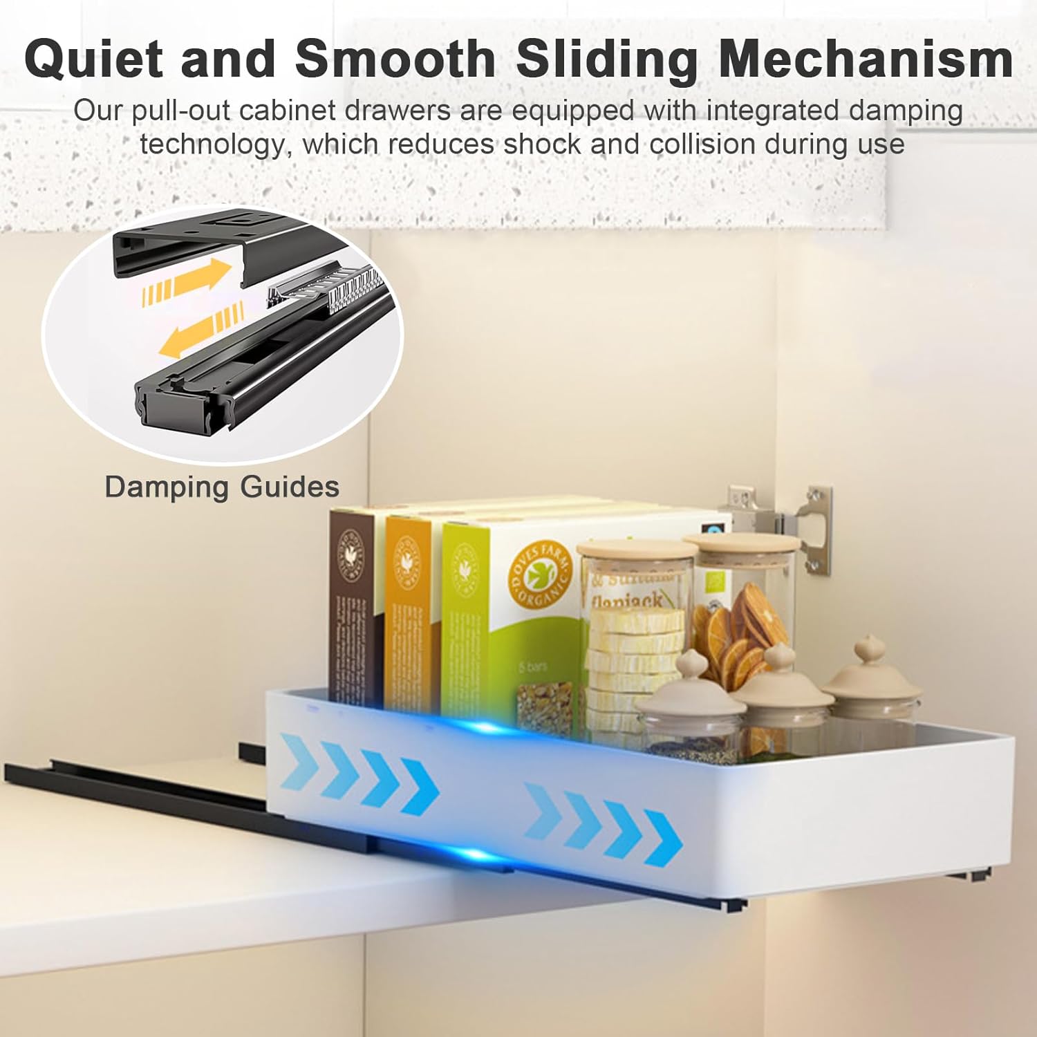QUIET AND SMOOTH SLIDING MECHANISM: Our pull-out cabinet drawers are equipped with integrated damping technology, which reduces shock and collision during use. This feature ensures that the drawers glide smoothly and quietly, preventing any rattling or noise while you open or close them. Enjoy a seamless and peaceful experience when accessing your stored items, making it a pleasant addition to your home