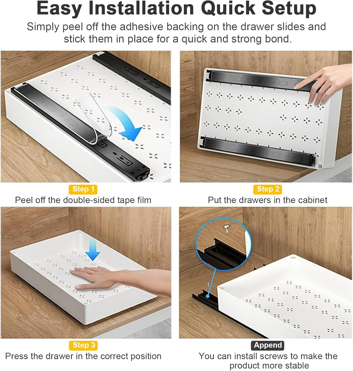 EFFORTLESS INSTALLATION FOR QUICK SETUP: Installation is a breeze with our pull-out drawers! Simply peel off the adhesive backing on the drawer slides and stick them in place for a quick and strong bond. For added security, screws are included to further reinforce the drawers if needed. This straightforward setup process ensures that your new storage solution is up and running in no time without the need for complicated tools or professional help
