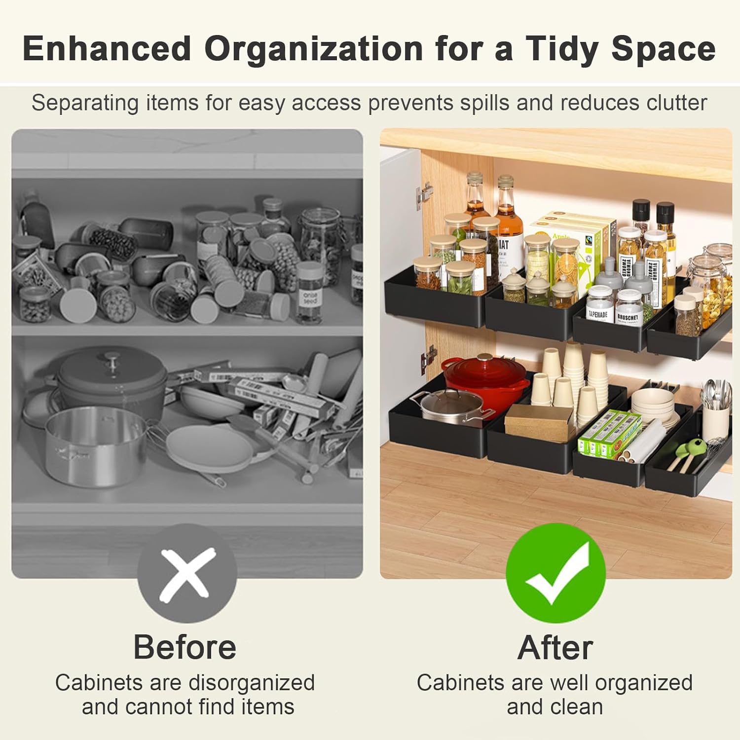 ENHANCED ORGANIZATION FOR A CLUTTER-FREE SPACE: These pull-out drawers are perfect for keeping your kitchen essentials—like spices, cutlery, or cleaning supplies—neatly organized. By keeping items separated and easy to access, you can prevent spills and reduce clutter. The smooth sliding drawers allow you to pull out just what you need without disturbing other items, making it easier to maintain an organized and efficient space