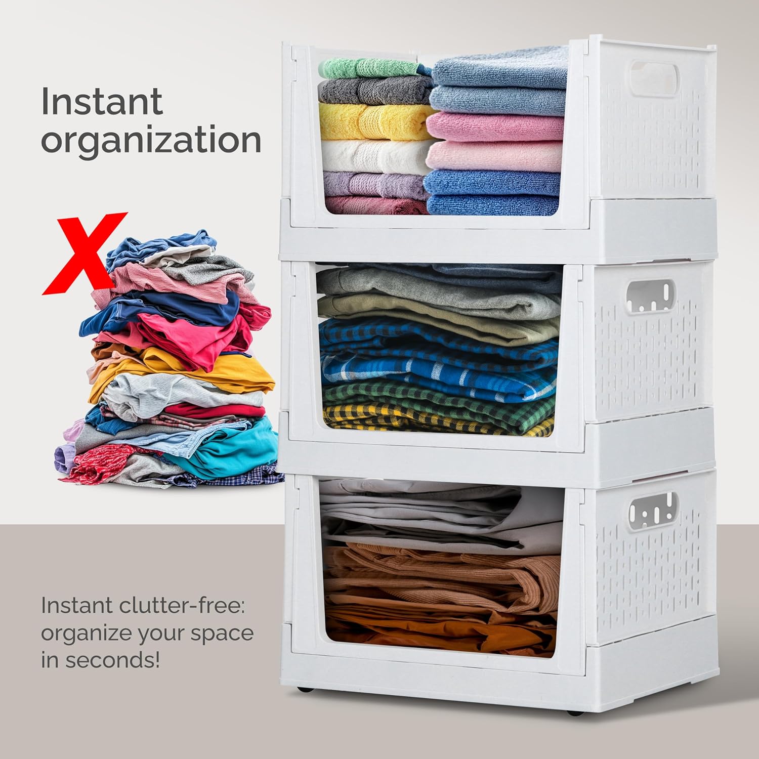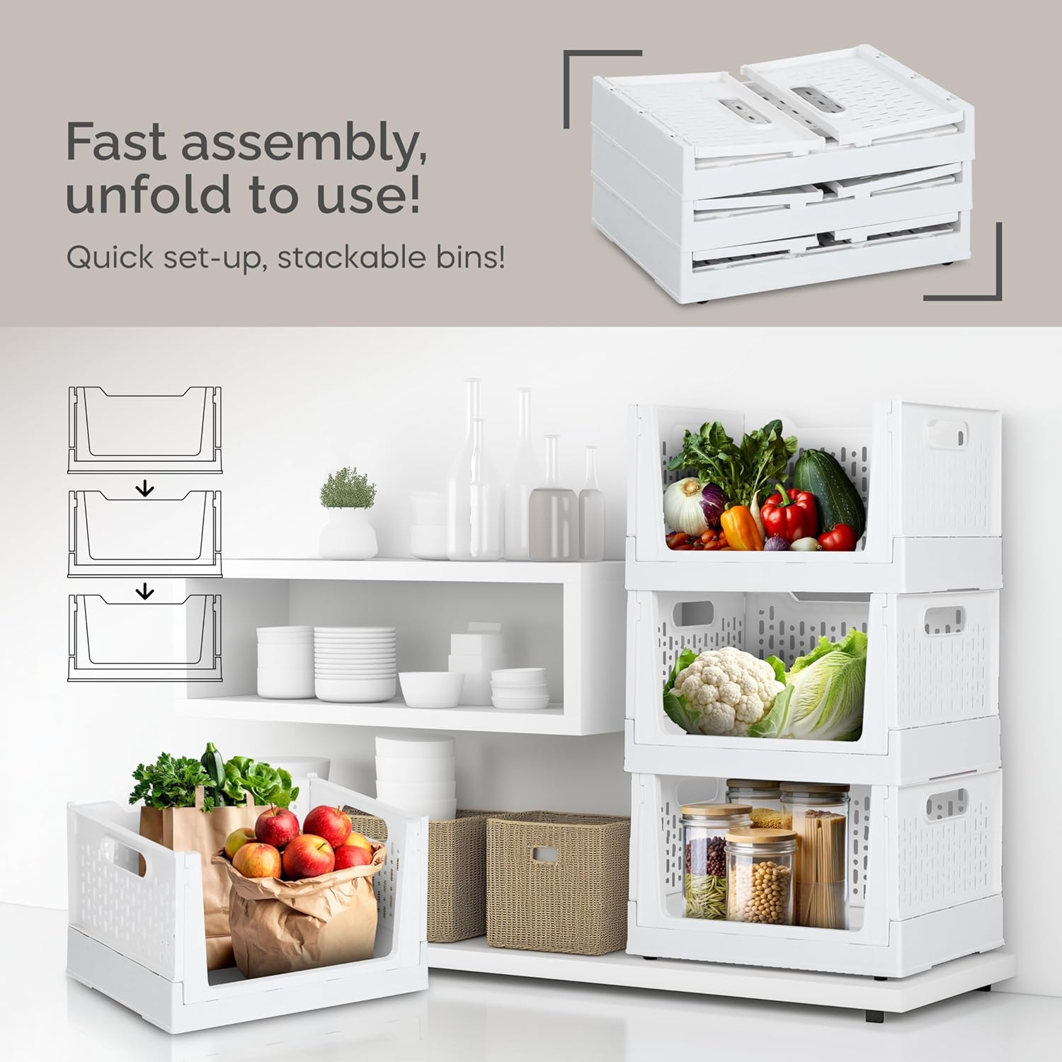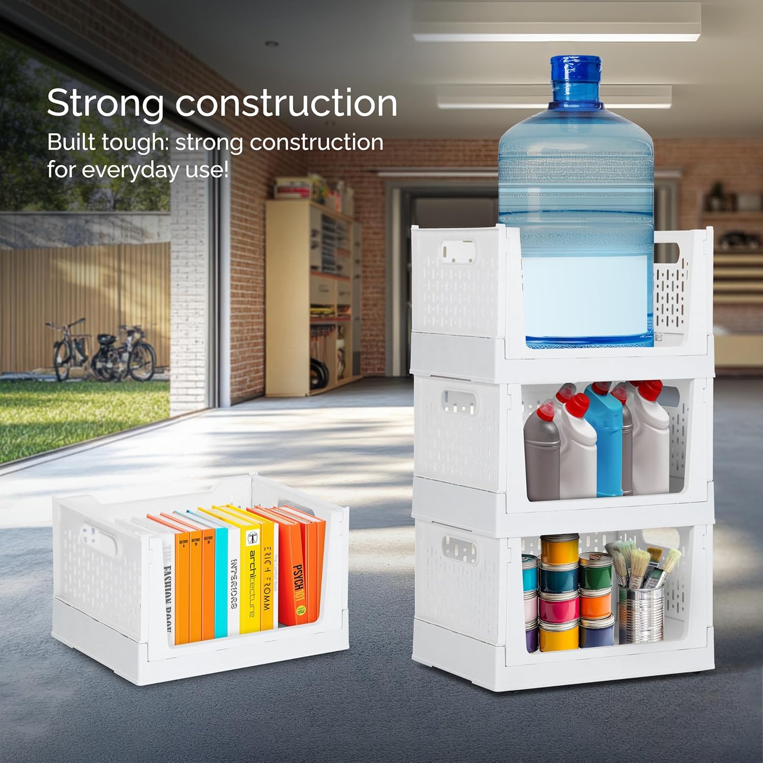 [Space-Saving Design]: Optimize your storage space with stackable and foldable bins. When not in use, simply fold them down to free up space. The generous size accommodates a variety of items, and the snap design on both sides prevents tipping, ensuring your stacked bins stay securely in place.