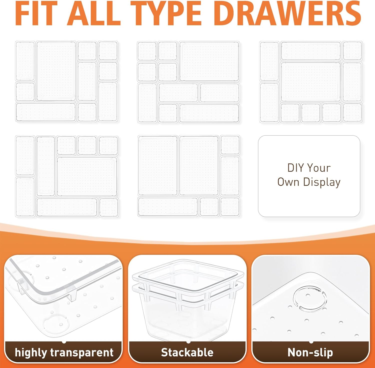 Premium Quality and Multi-functional: Made of sturdy and premium plastic drawers organizer material, these clear organizer bins are not only easy to clean but also allow you to easily locate items
