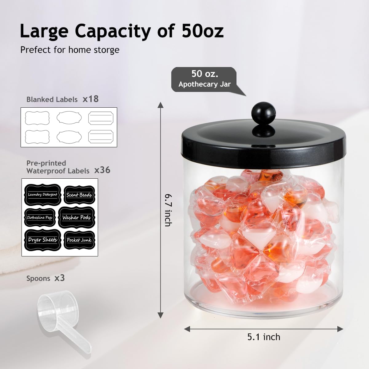 ✅【Versatile Storage Solution】Our large-capacity jars are perfect for laundry pods, detergent pods, and laundry powder. They meet various storage needs in your laundry room. Also perfect for small bath bombs, bath salts, guest soaps, cotton balls, cotton swabs, cotton pads, flosspicks, seashells, and other decorative items in the bathroom. Plus, they’re also great for organizing items in the pantry or studio.