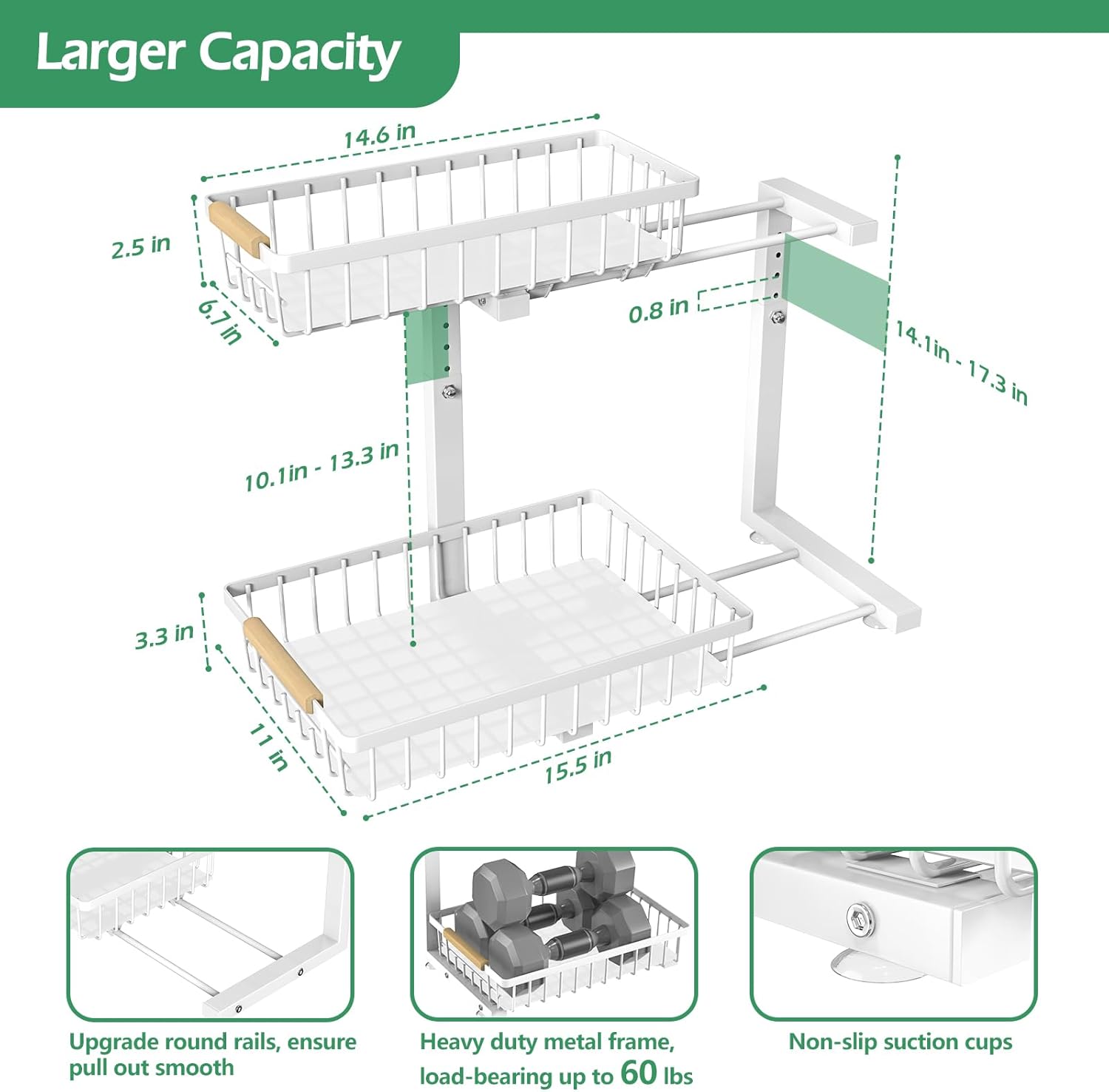This kitchen organizers and storage feature a practical design with 5-level of height adjustable, the height can be adjusted from 14.1 inches to 17.3 inches, can fit different under sink’s size, maximizing storage under the sink.